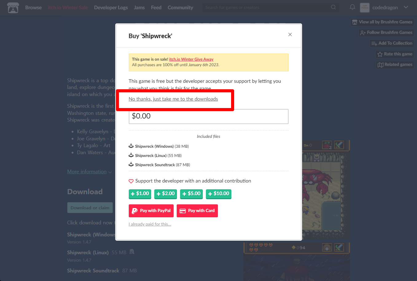 "Shipwreck" 구매창에서 [No thanks, just take me to the downloads] 링크를 클릭합니다.