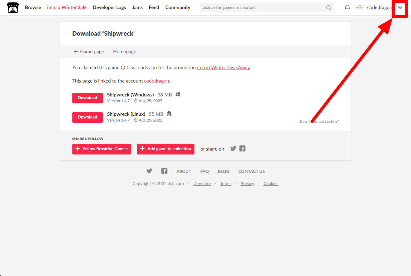 itch.io에서 받은 "Shipwreck" 게임 확인하고 설치파일 다운받아 보겠습니다. 우측 상단의 나의 사용자명 오른쪽의 화살표 아이콘을 클릭합니다.