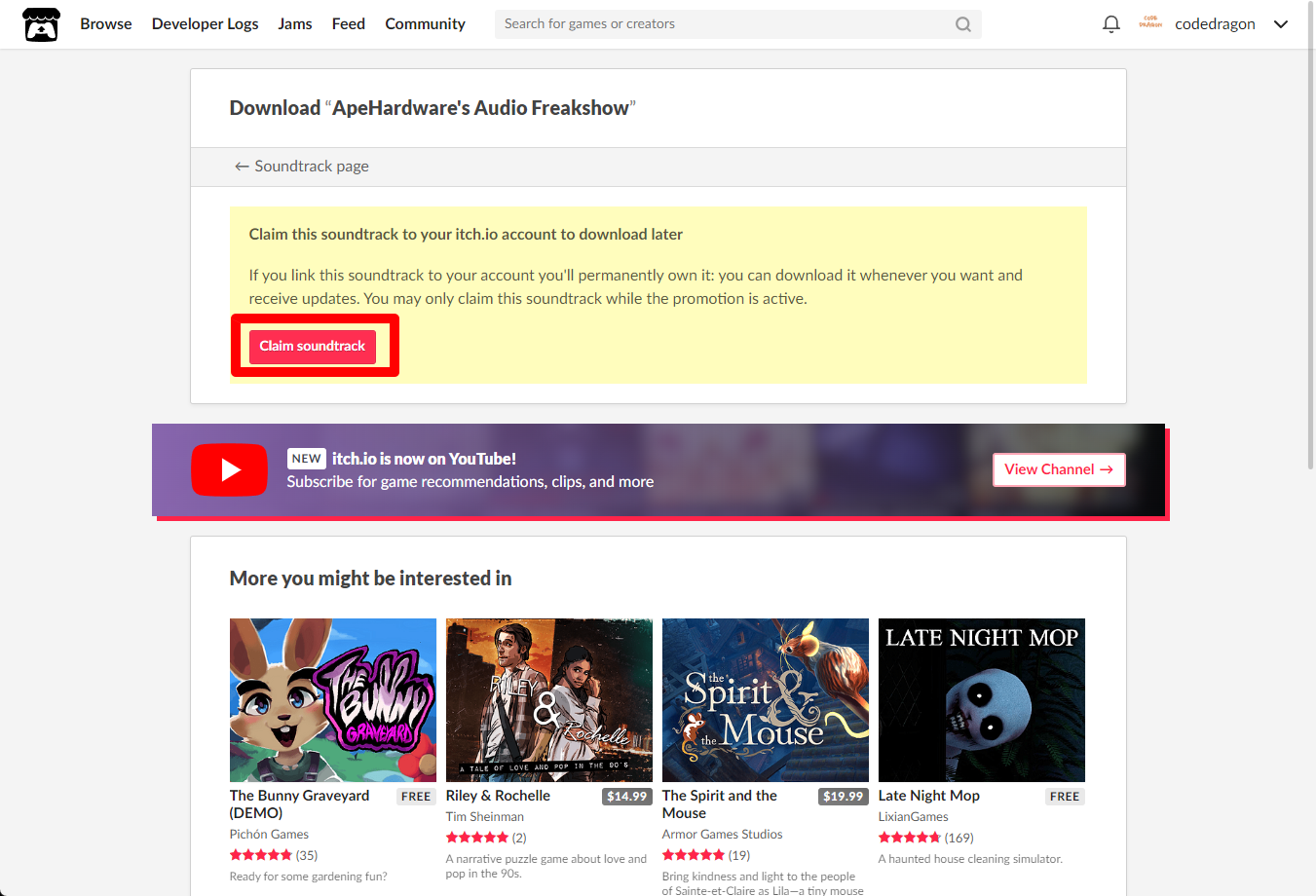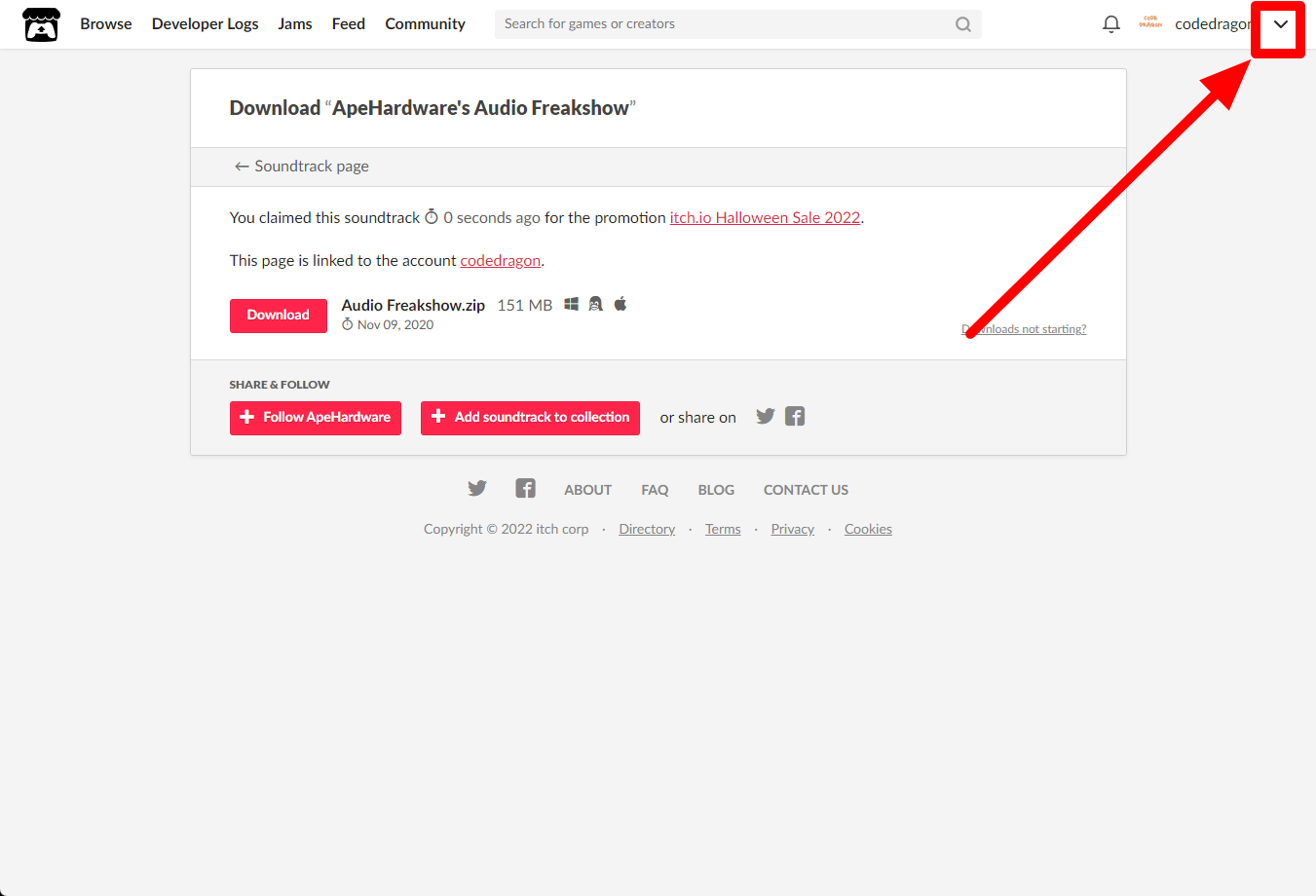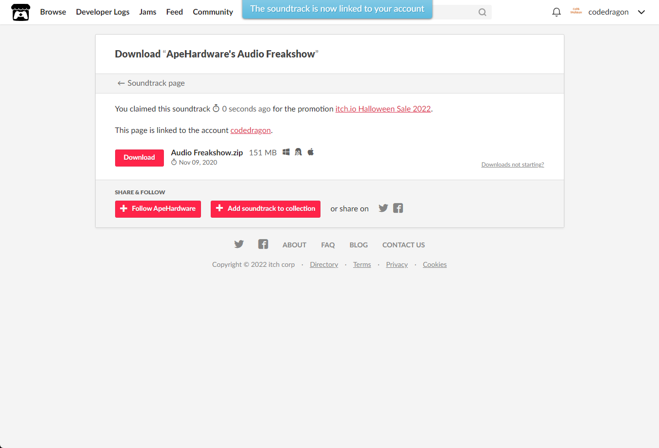 [Claim soundtrack]을 클릭하면 "ApeHardware's Audio Freakshow" 게임이 나의 게임 라이브러리에 추가되고 설치파일을 다운받을 수 있는 페이지로 이동됩니다.