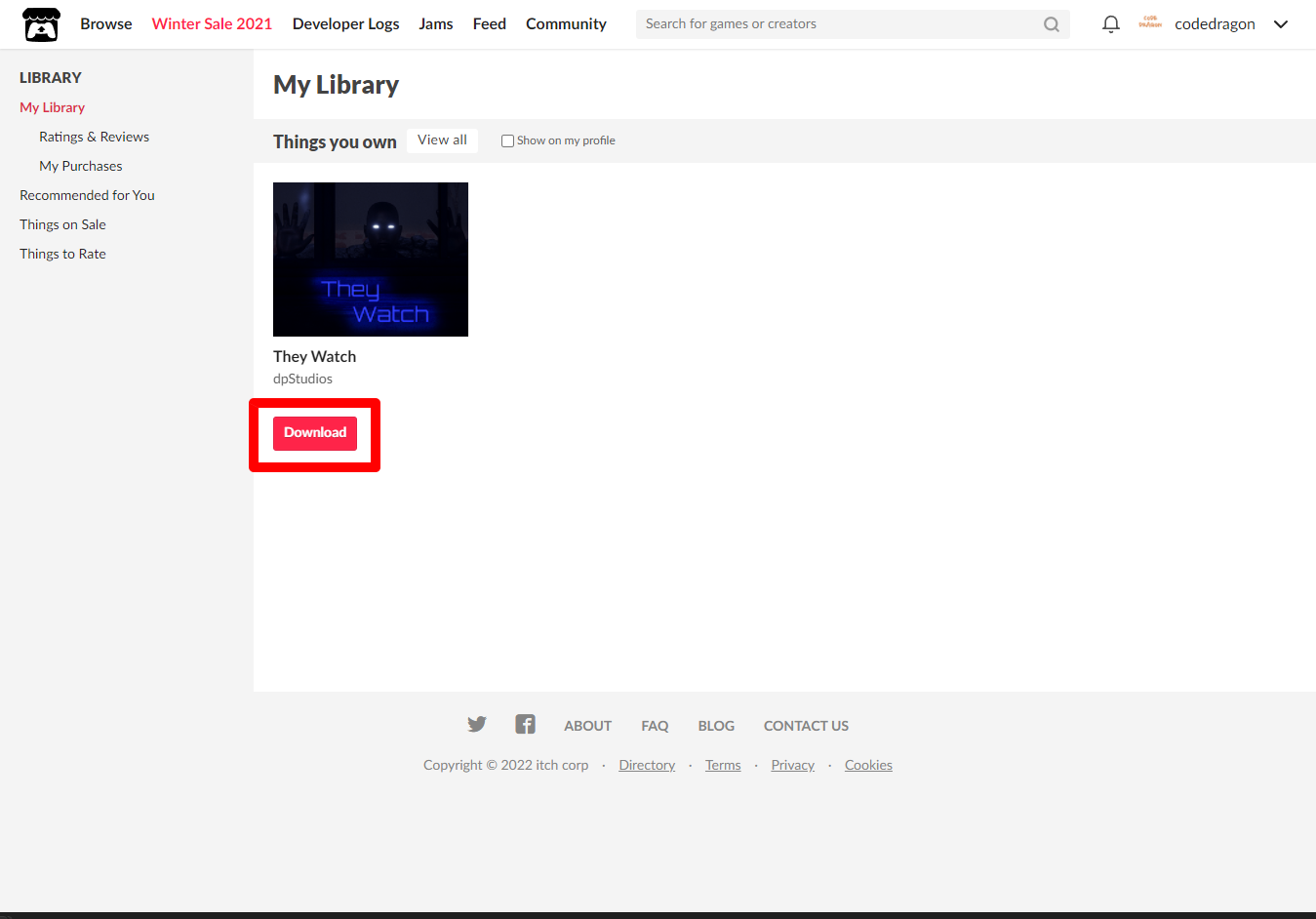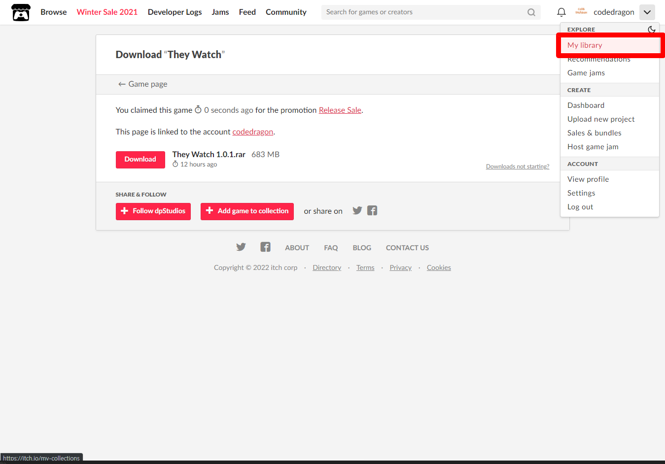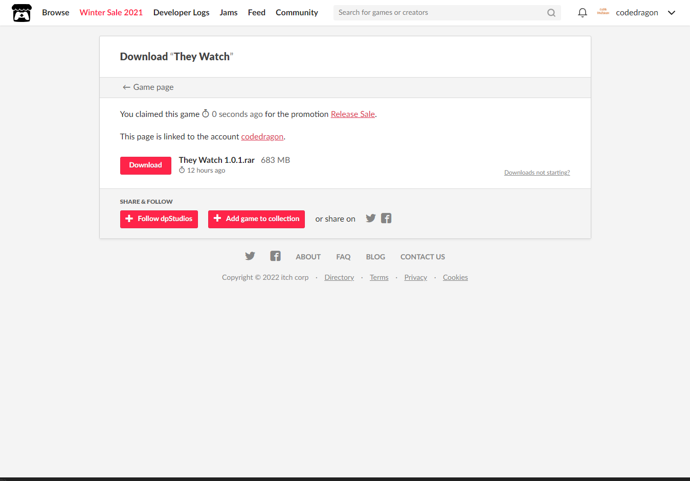 [Claim game]을 클릭하면 "They Watch" 게임이 나의 게임 라이브러리에 추가되고 설치파일을 다운받을 수 있는 페이지로 이동됩니다.