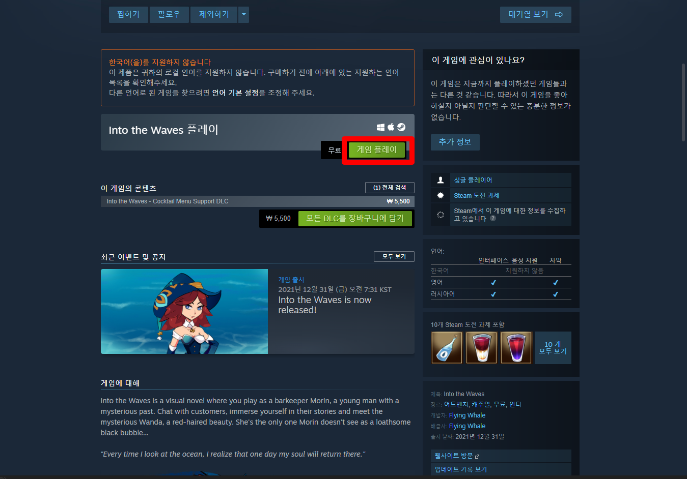 "Into the Waves" 페이지를 내려 [게임 플레이]를 클릭하면 됩니다.
