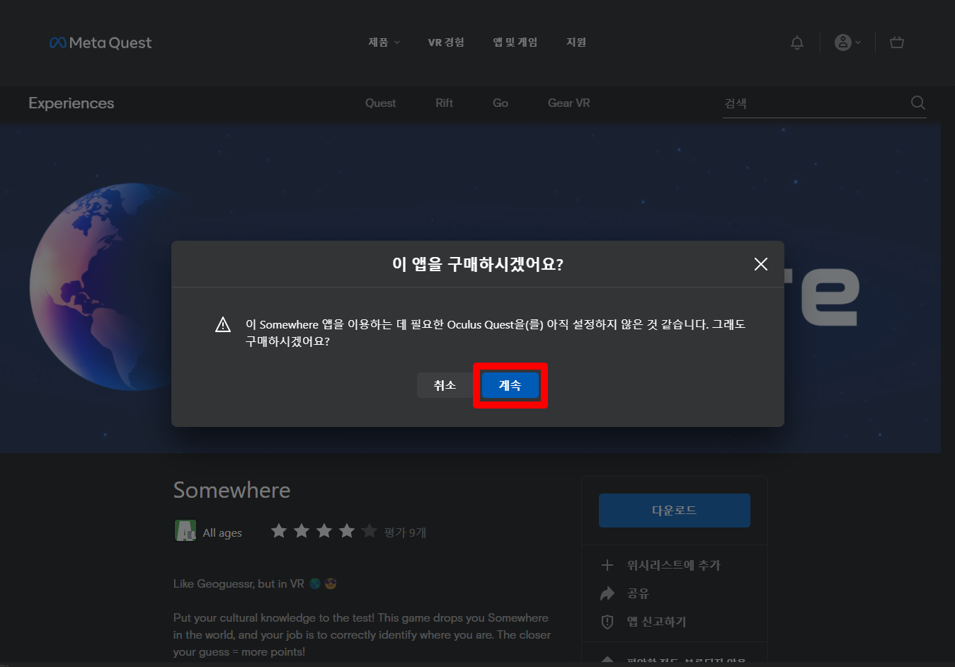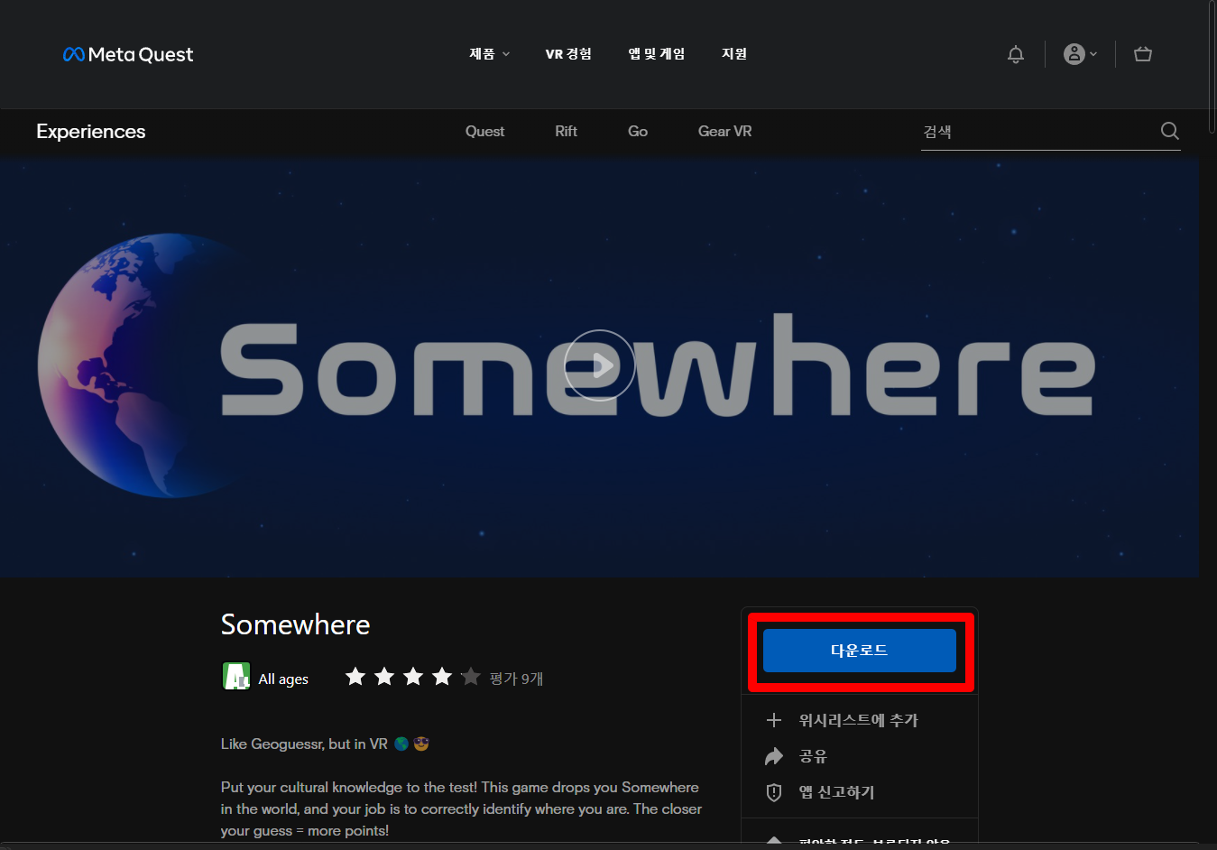 "Somewhere" 게임페이지에 있는 [다운로드] 버튼 클릭합니다.
