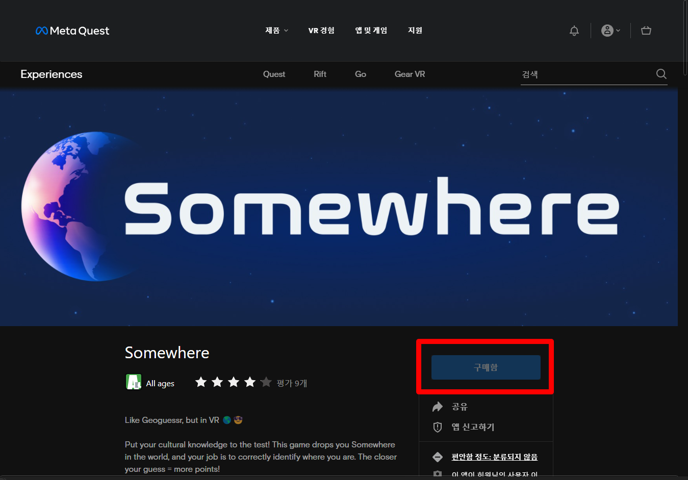 "Somewhere" 게임 페이지를 보면 "구매함"으로 표시되어 있어 가지고 있는 것 확인할 수 있습니다.