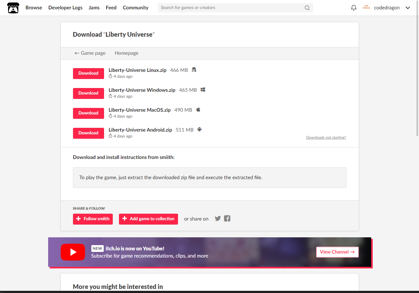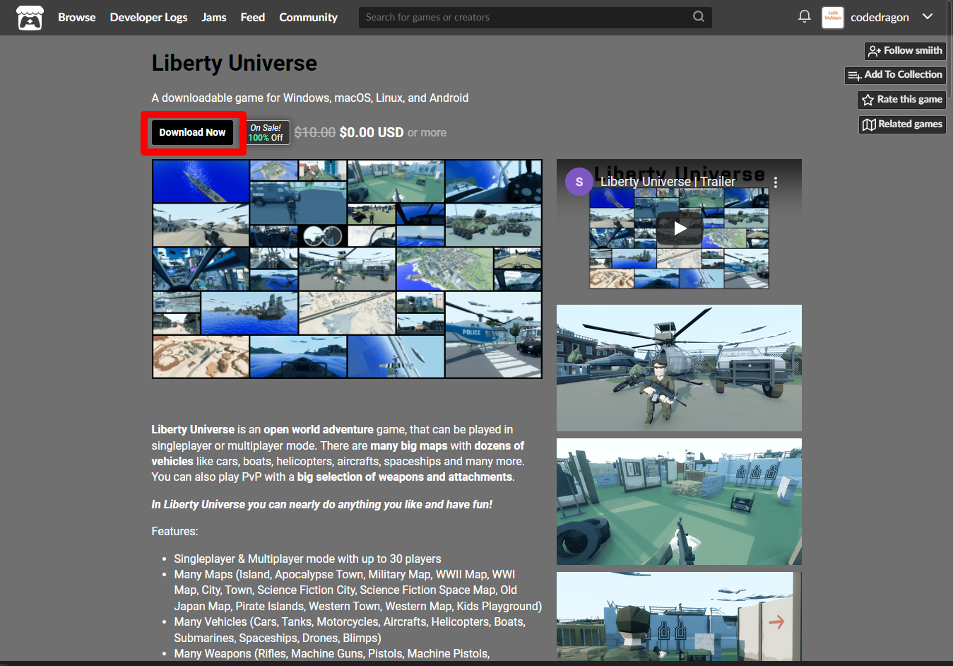 "Liberty Universe" 해당 항목에 있는 [Download] 버튼을 클릭하면 게임의 설치파일을 다운받을 수 있습니다.