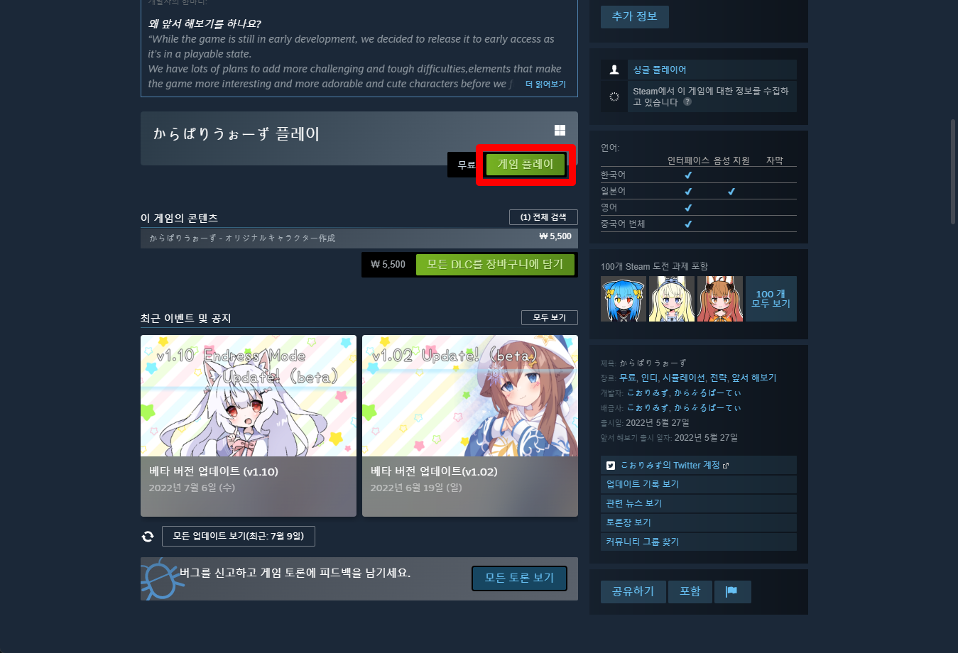 "からぱりうぉーず" 페이지를 내려 [게임 플레이]를 클릭하면 됩니다.