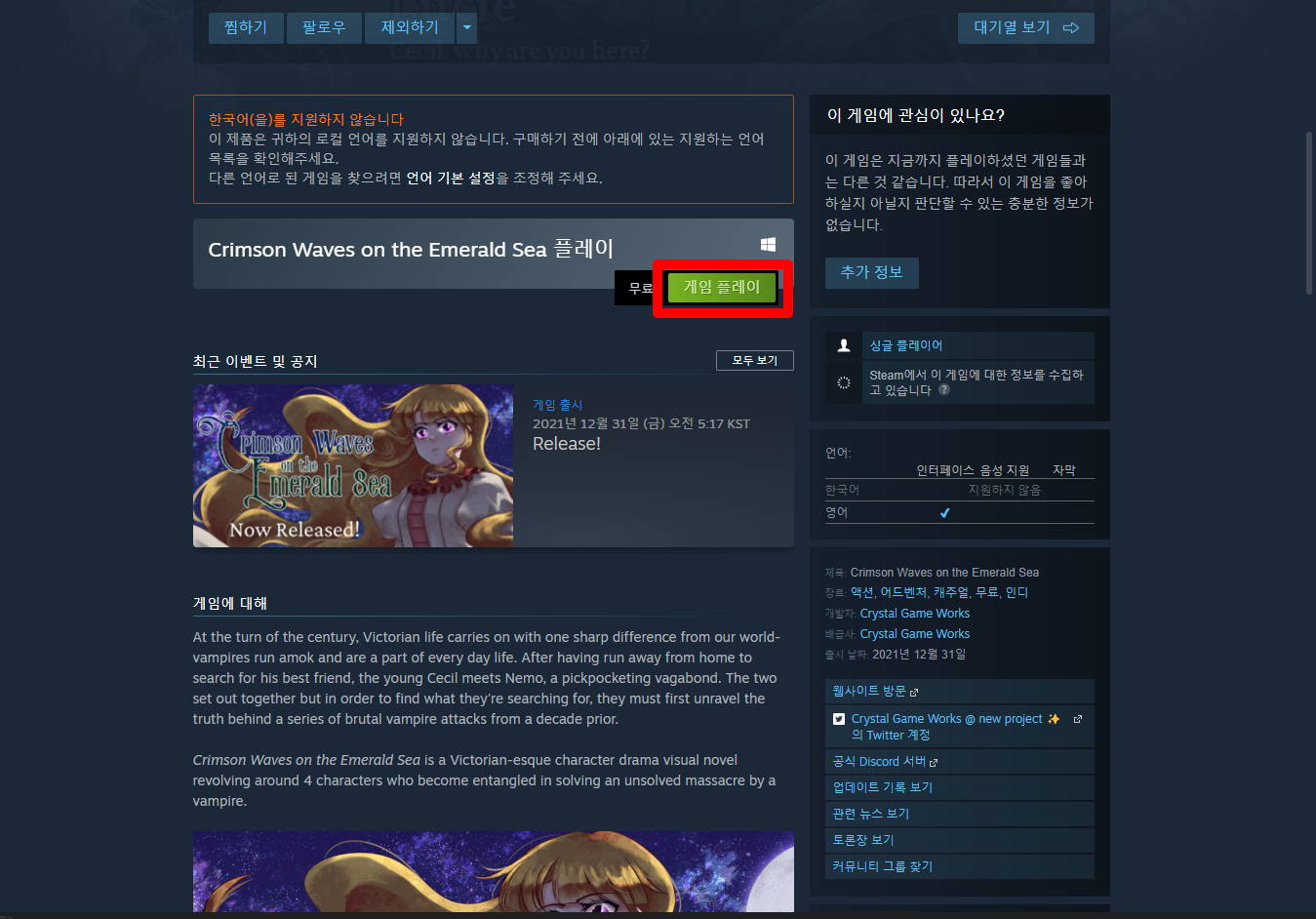 "Crimson Waves on the Emerald Sea" 페이지를 내려 [게임 플레이]를 클릭하면 됩니다.