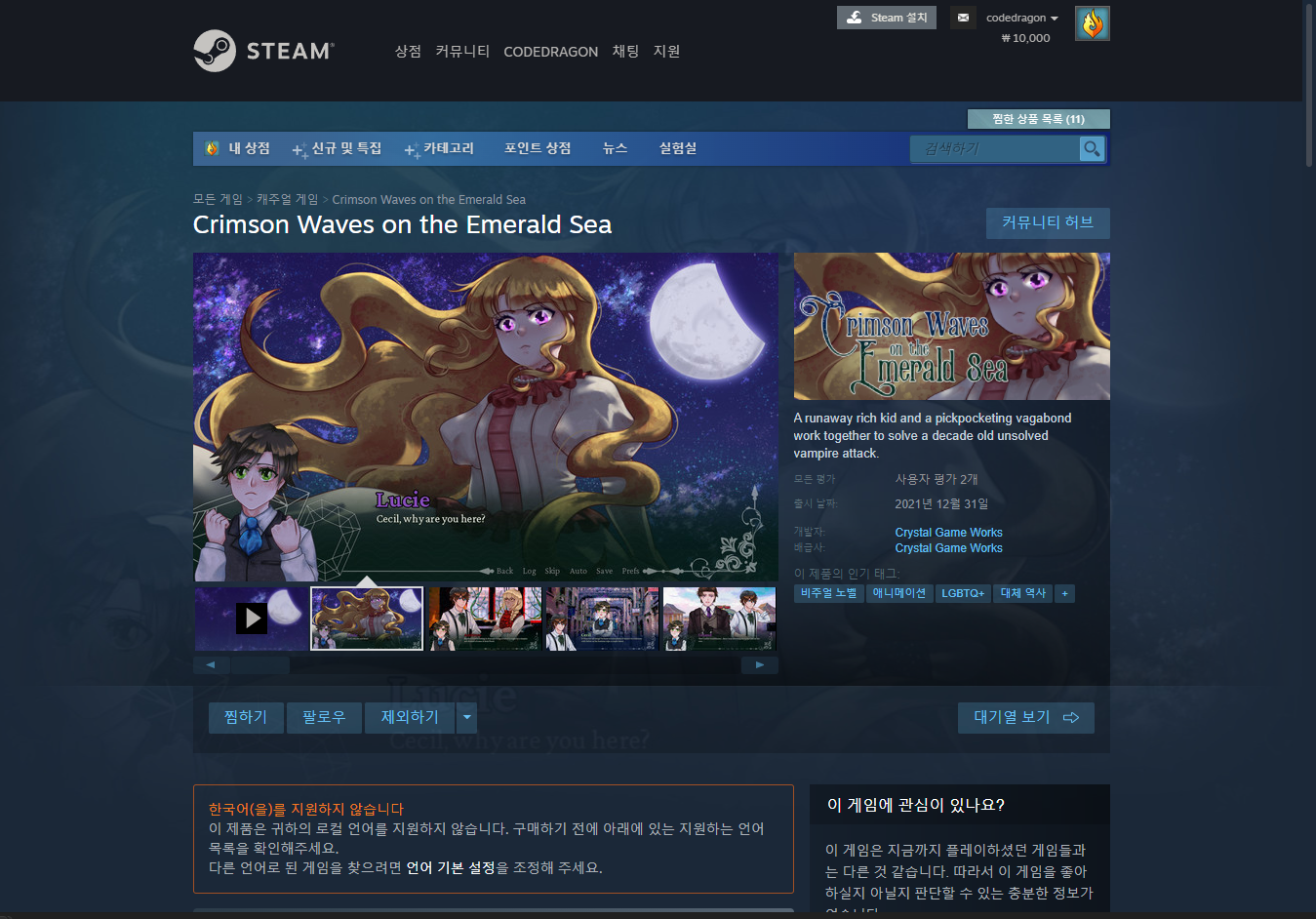 "Crimson Waves on the Emerald Sea" 스팀 페이지 입니다.