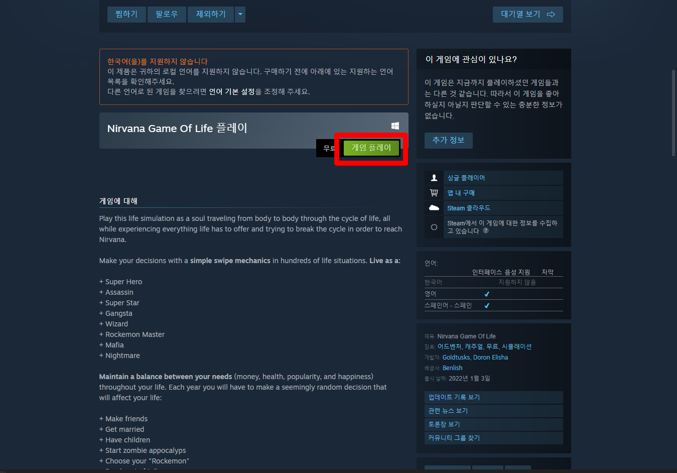 "Nirvana Game Of Life" 페이지를 내려 [게임 플레이]를 클릭하면 됩니다.