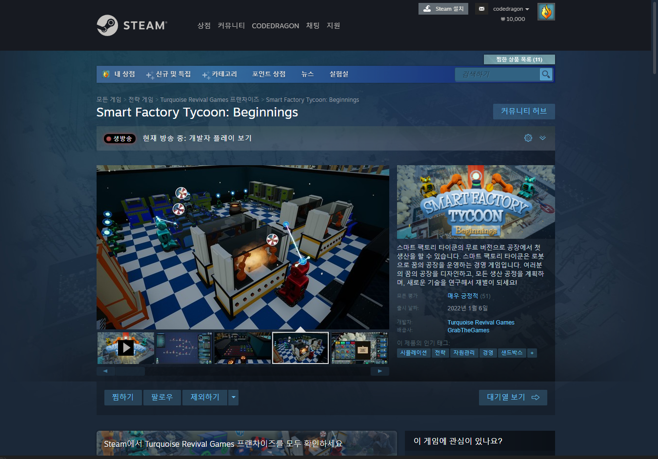 "Smart Factory Tycoon: Beginnings" 스팀 페이지 입니다.