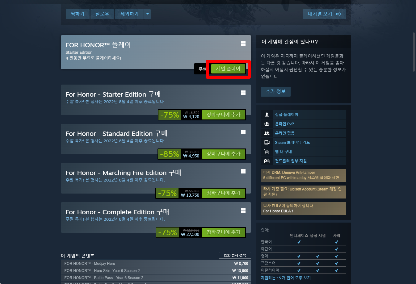 "FOR HONO" 게임페이지를 조금 내려서 [게임 플레이] 버튼을 클릭하면 됩니다.