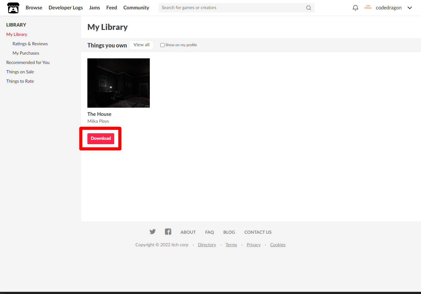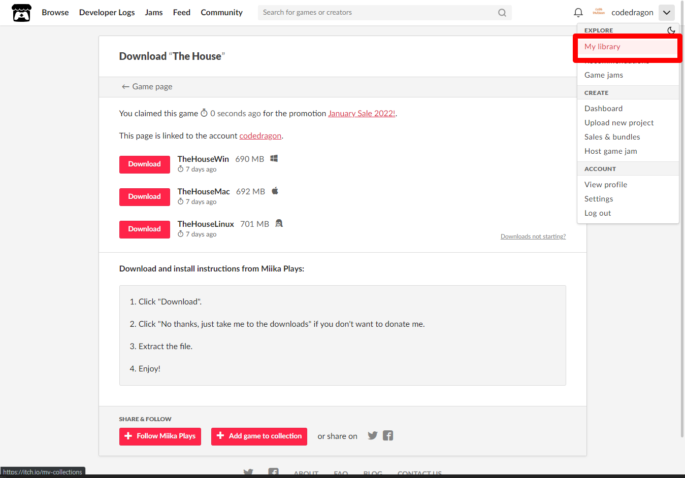 "My Lirary"에서 방금 받은 "The House" 게임 항목을 확인할 수 있습니다.