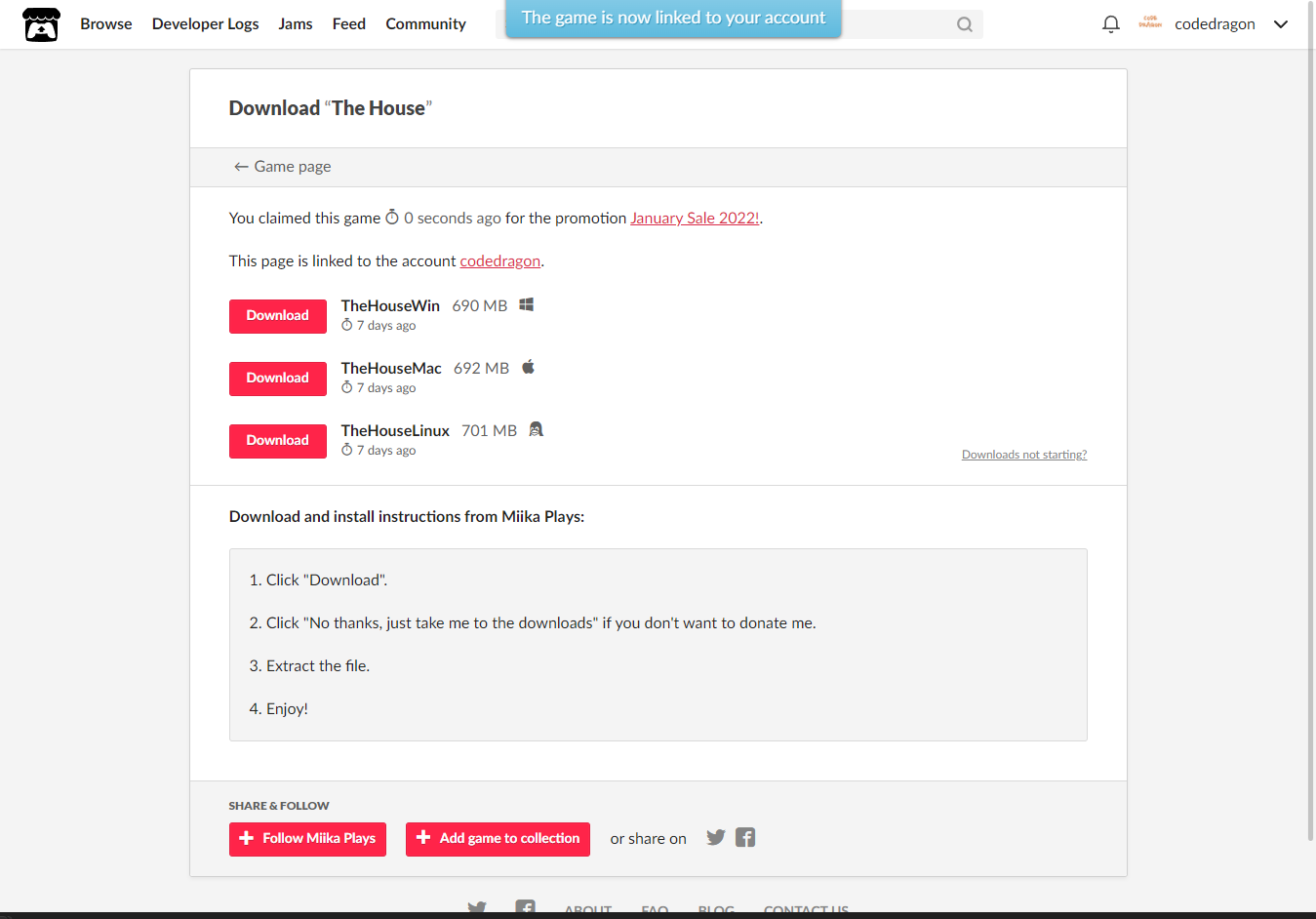 [Claim game]을 클릭하면 "The House" 게임이 나의 게임 라이브러리에 추가되고 설치파일을 다운받을 수 있는 페이지로 이동됩니다.