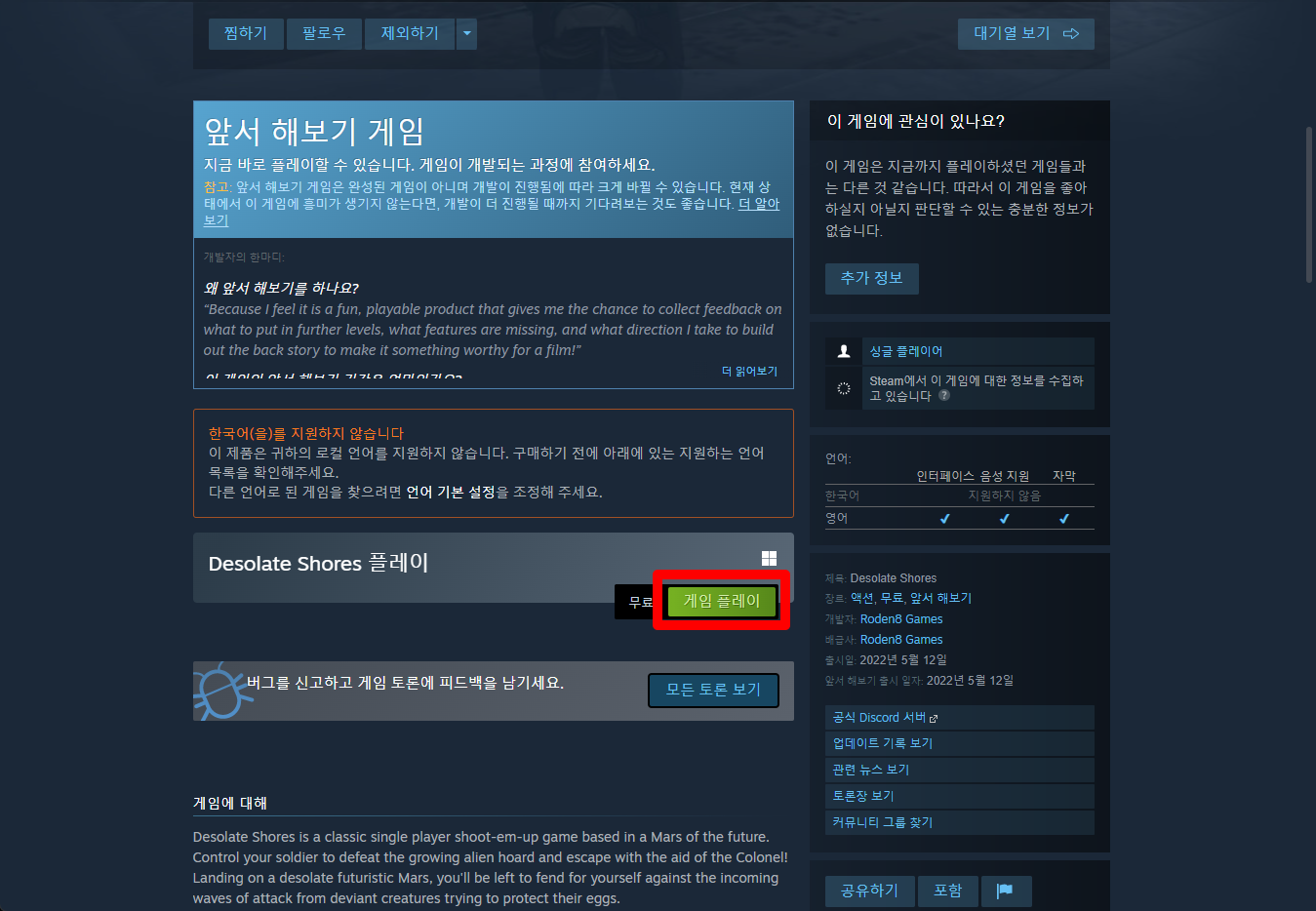 "Desolate Shores" 페이지를 내려 [게임 플레이]를 클릭하면 됩니다.