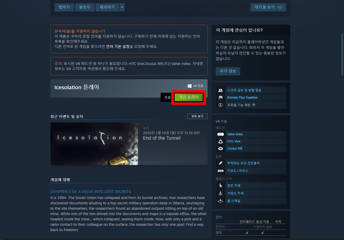"Icesolation" 페이지를 내려 [게임 플레이]를 클릭하면 됩니다.