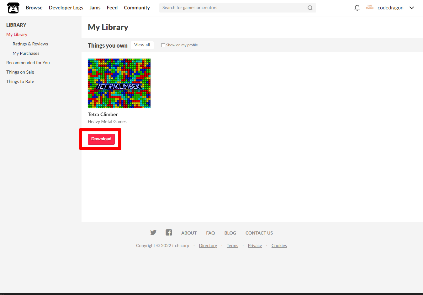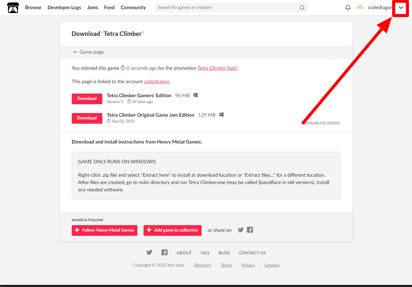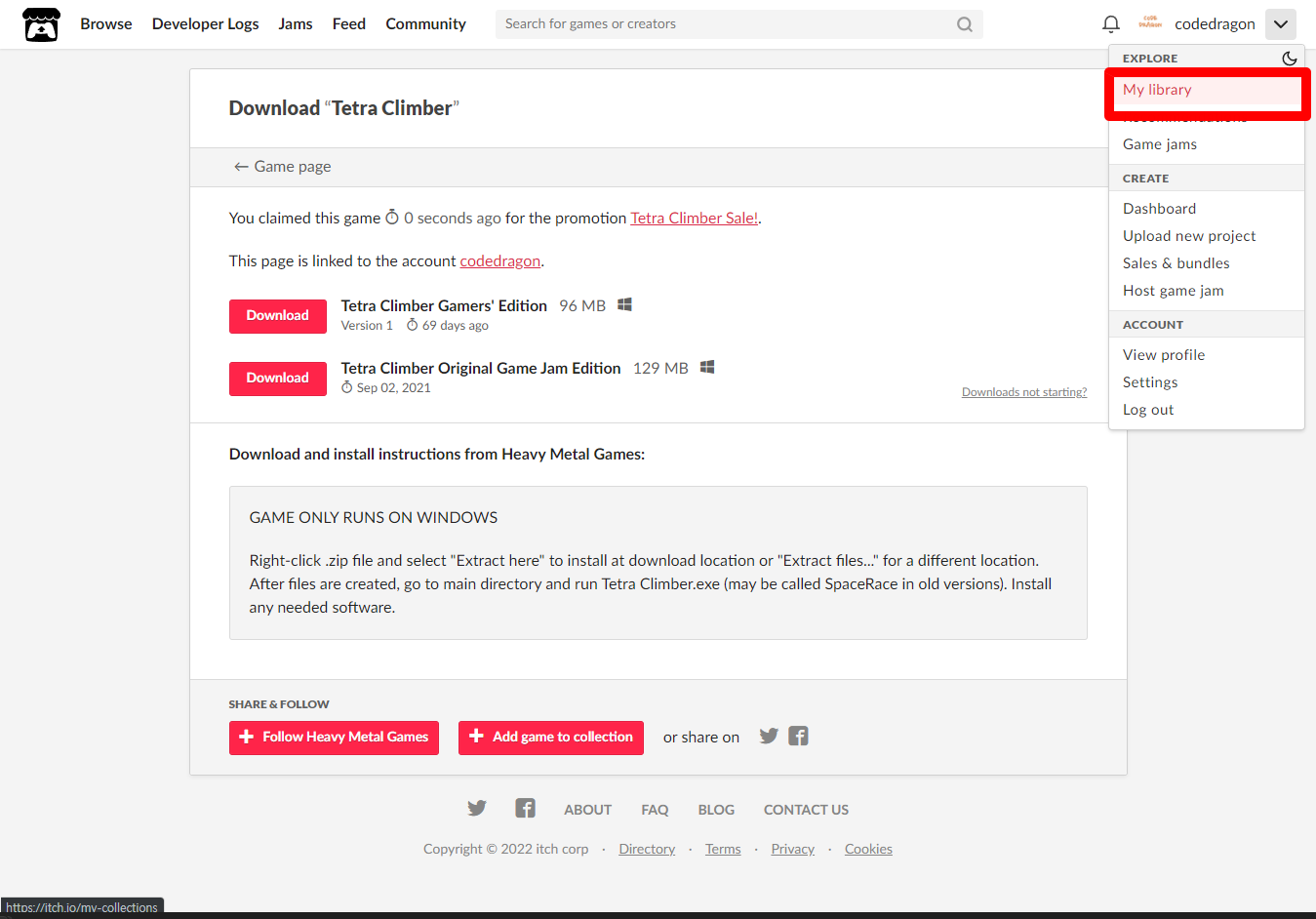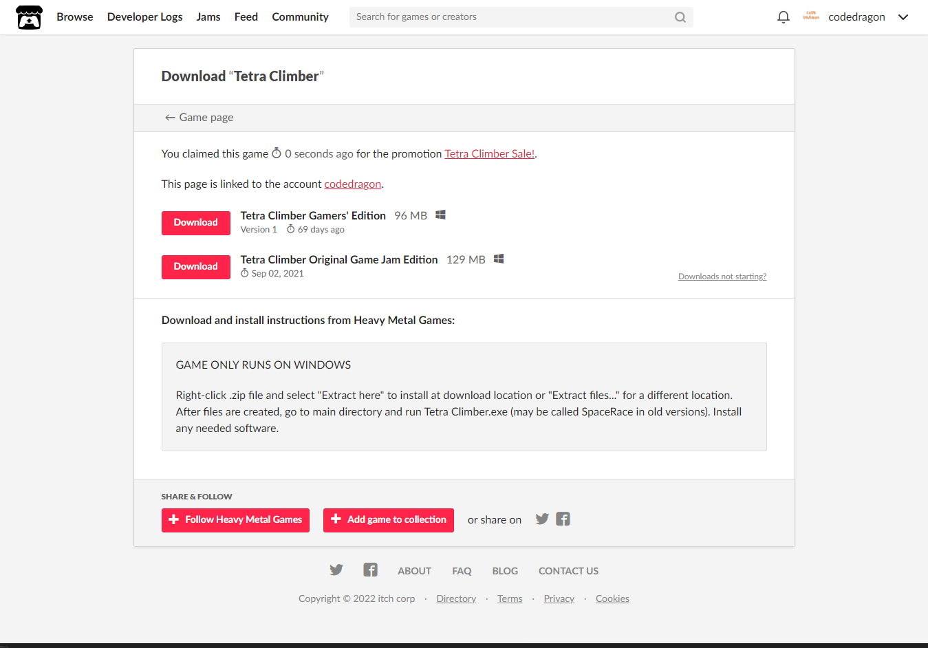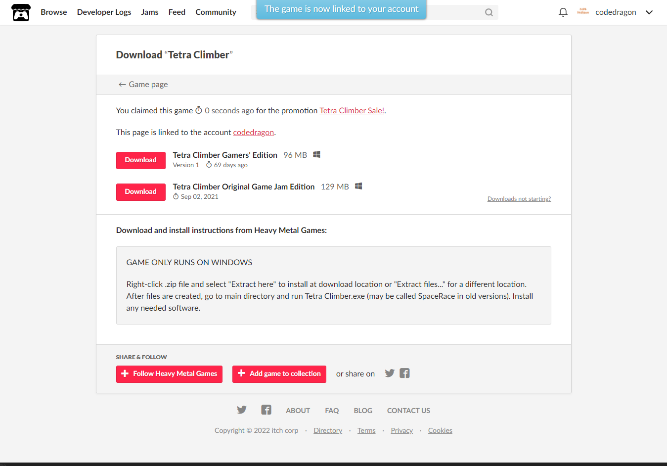 [Claim game]을 클릭하면 "Tetra Climber" 게임이 나의 게임 라이브러리에 추가되고 설치파일을 다운받을 수 있는 페이지로 이동됩니다.