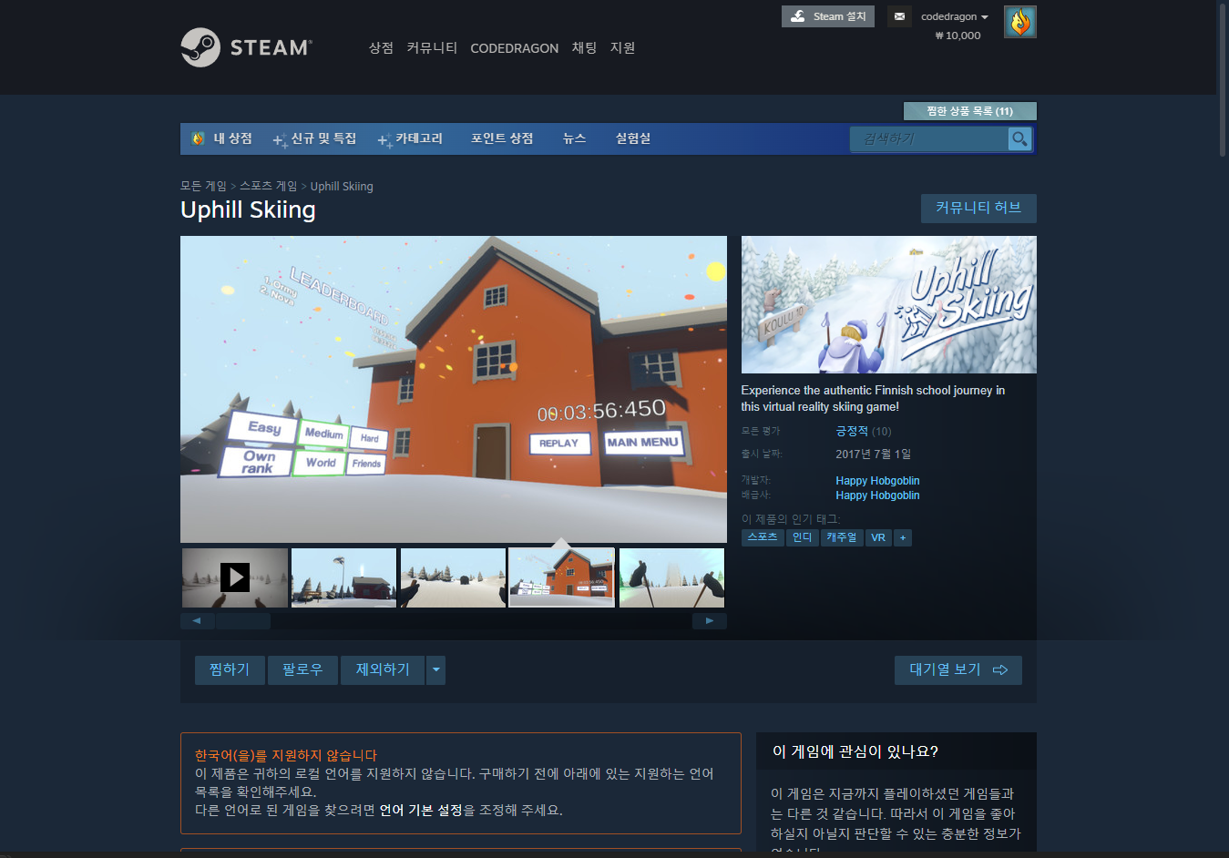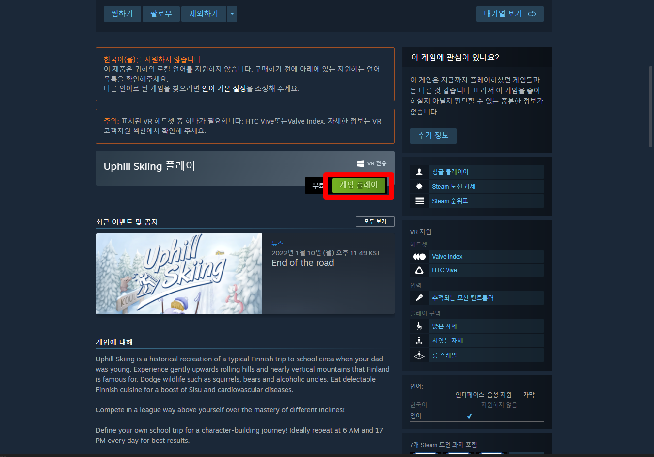 "Uphill Skiing" 페이지를 내려 [게임 플레이]를 클릭하면 됩니다.