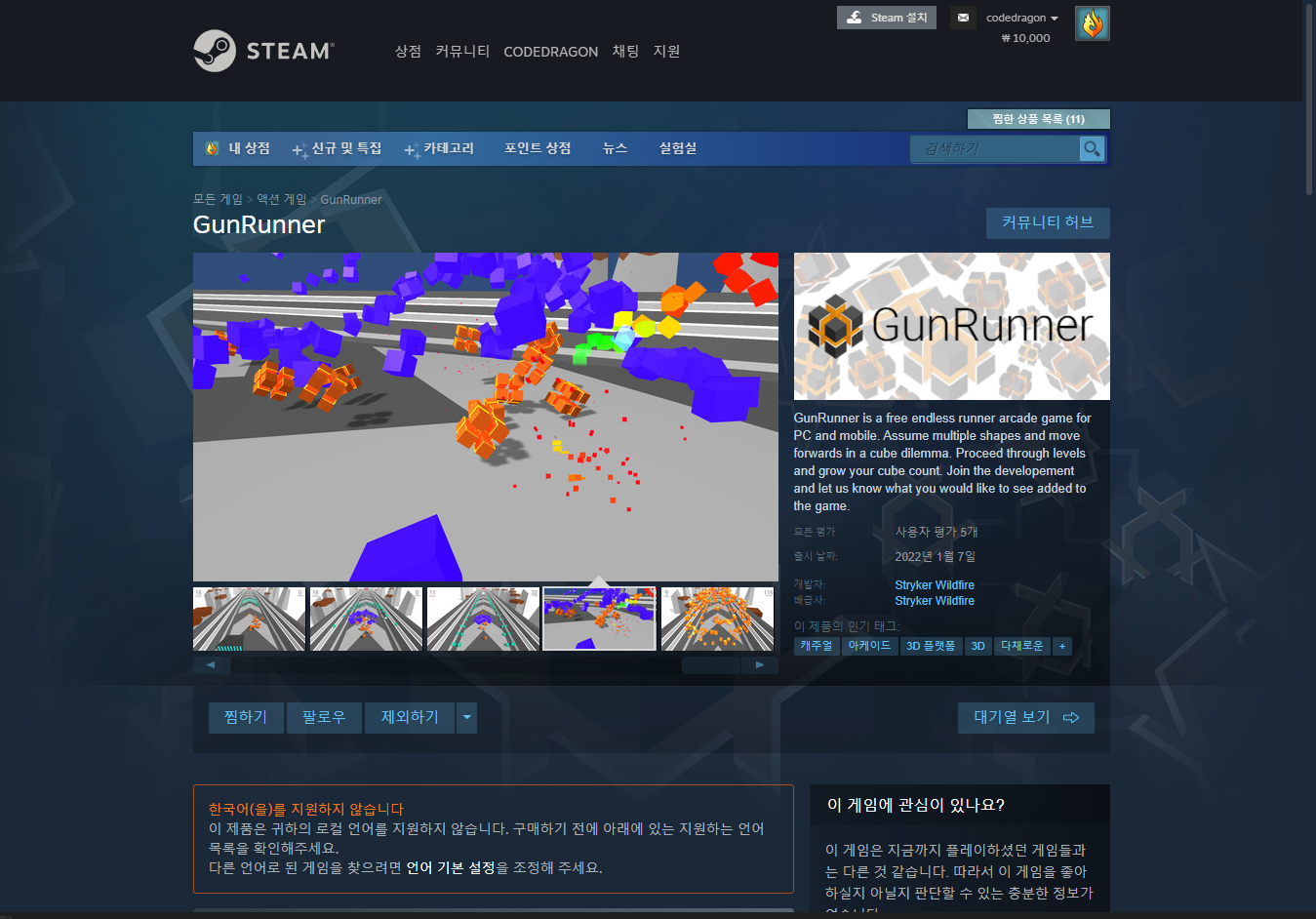 "GunRunner" 페이지를 내려 [게임 플레이]를 클릭하면 됩니다.