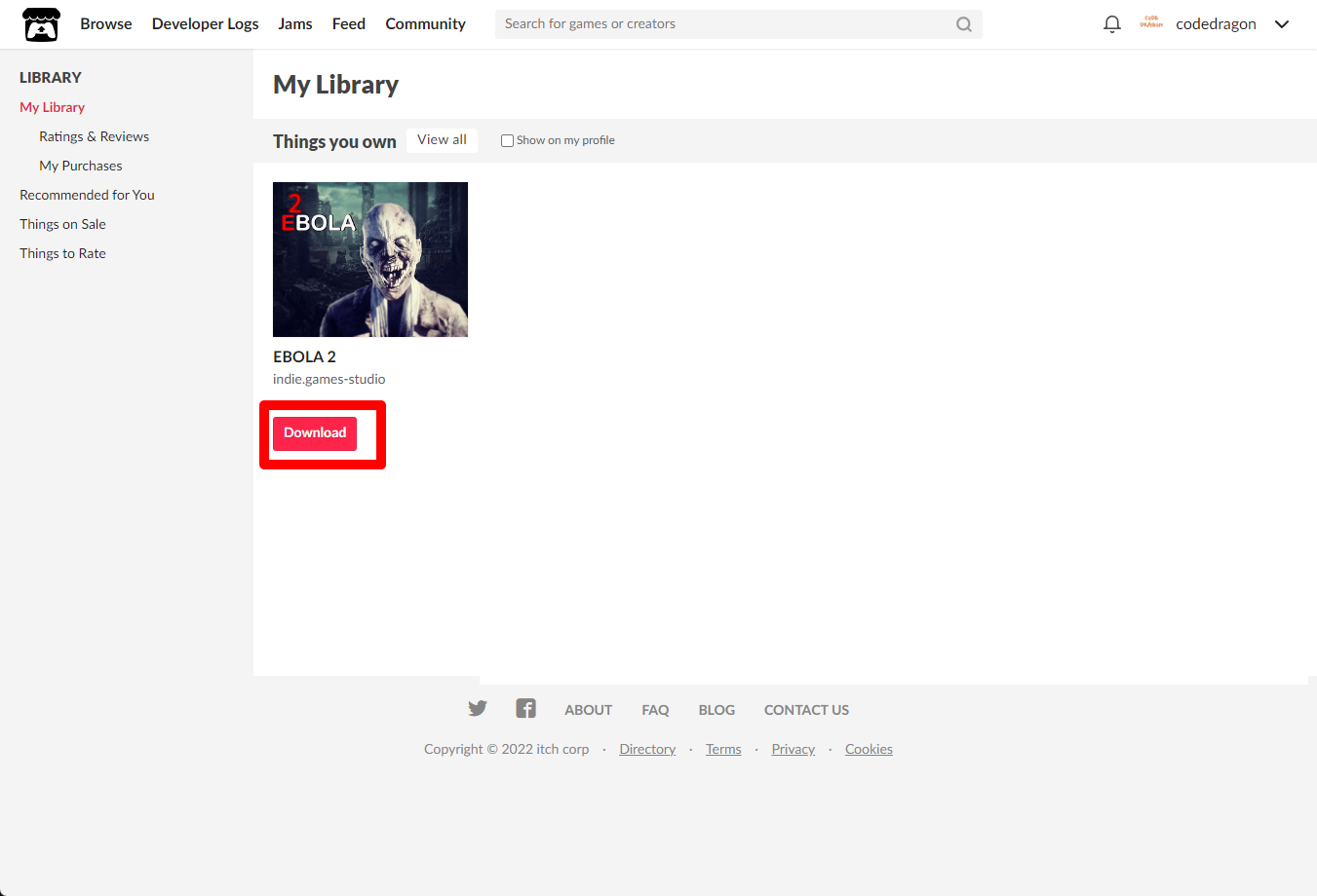 [Claim game]을 클릭하면 "EBOLA 2" 게임이 나의 게임 라이브러리에 추가되고 설치파일을 다운받을 수 있는 페이지로 이동됩니다.