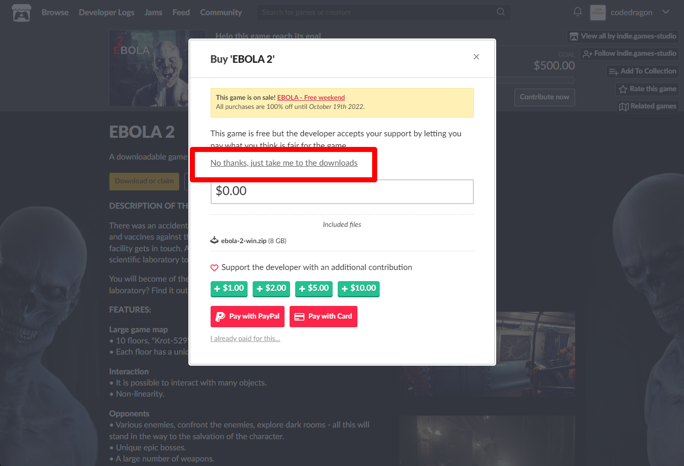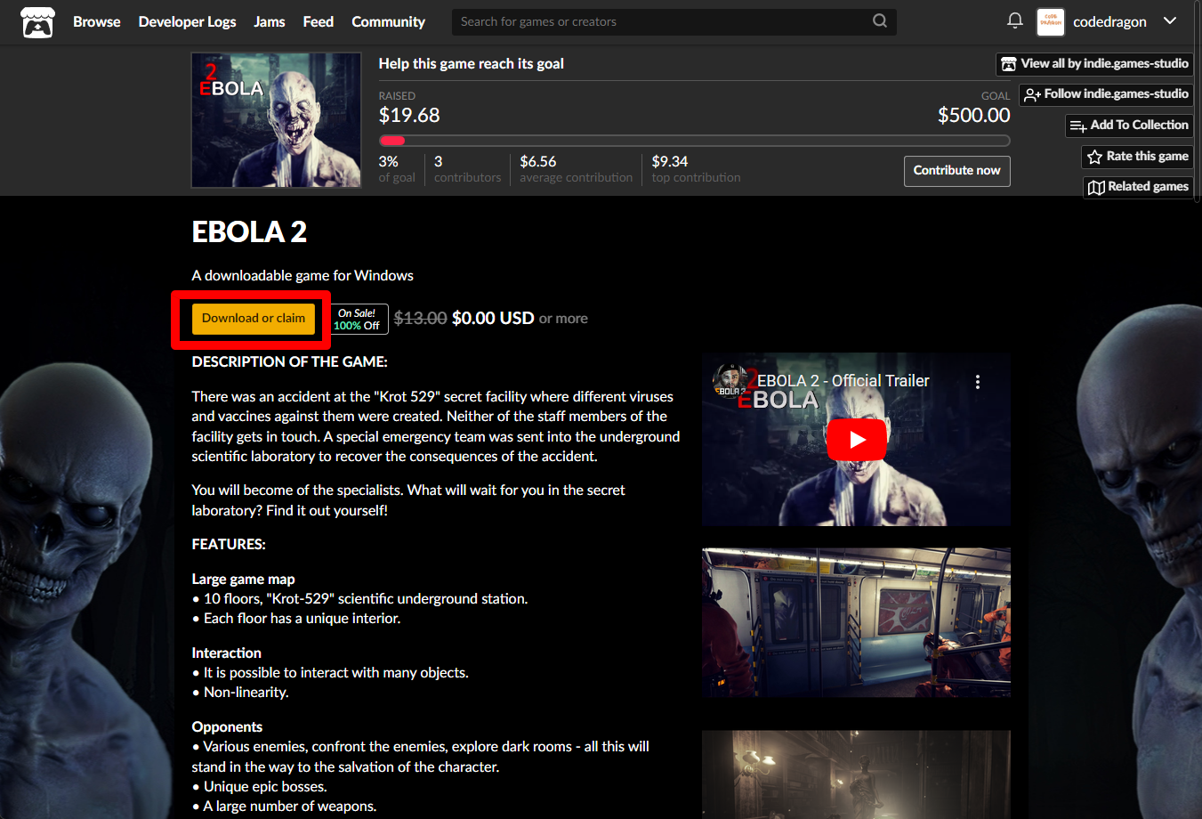 "EBOLA 2" 페이지에 있는 [Download or claim]을 클릭합니다.
