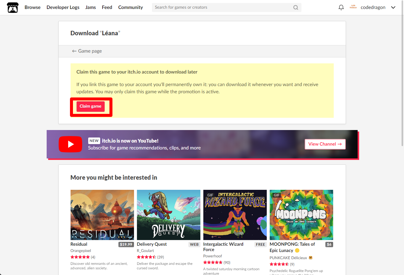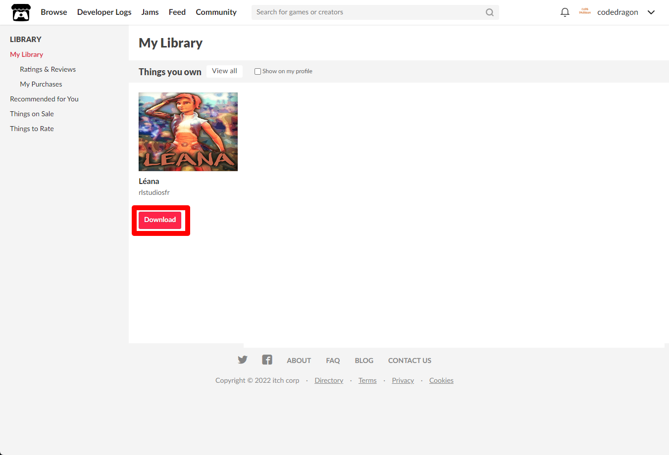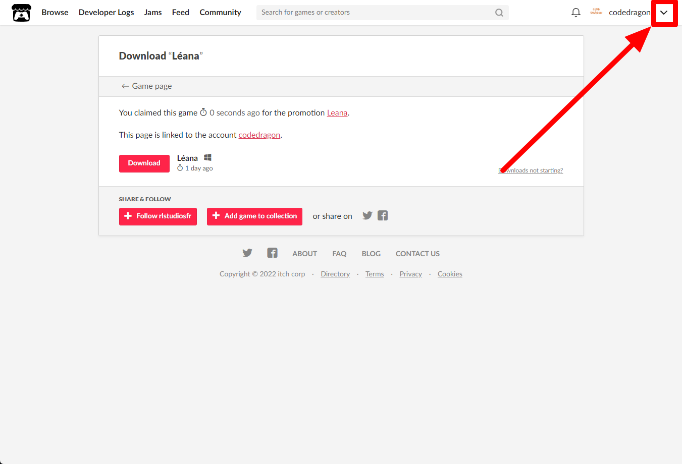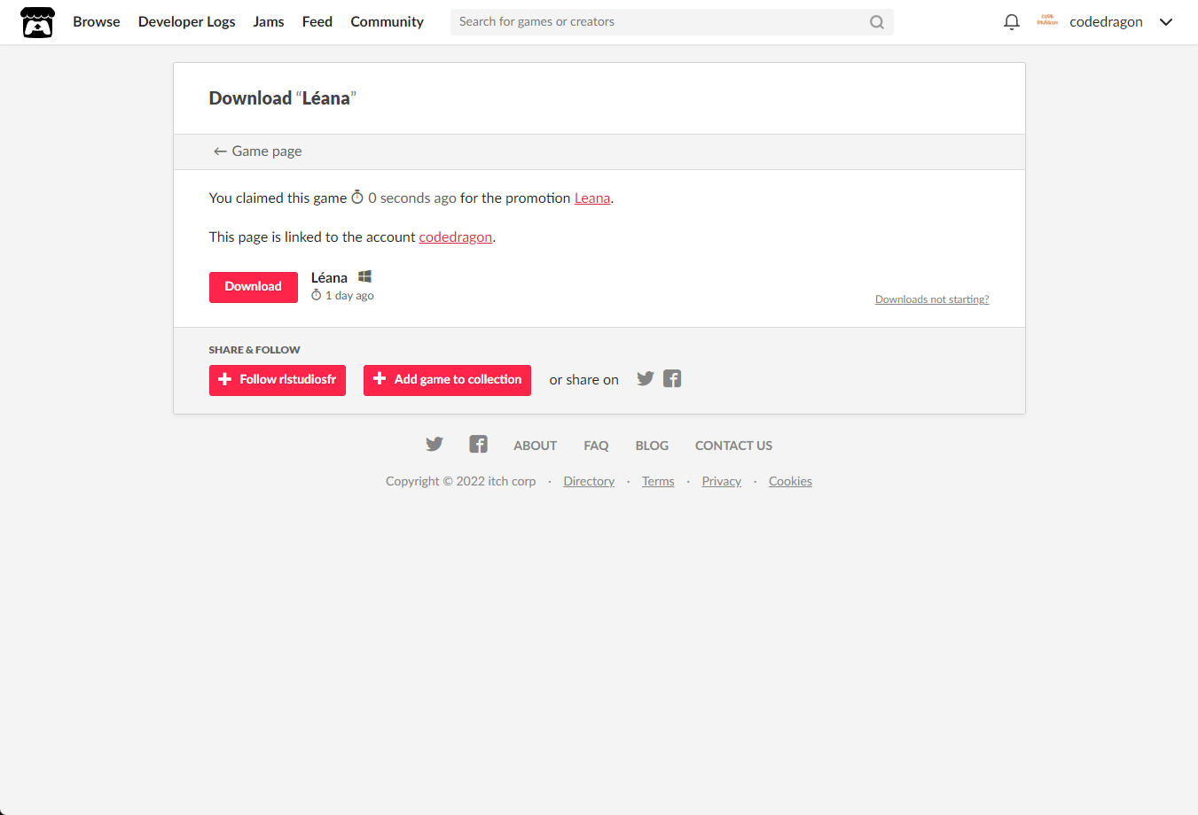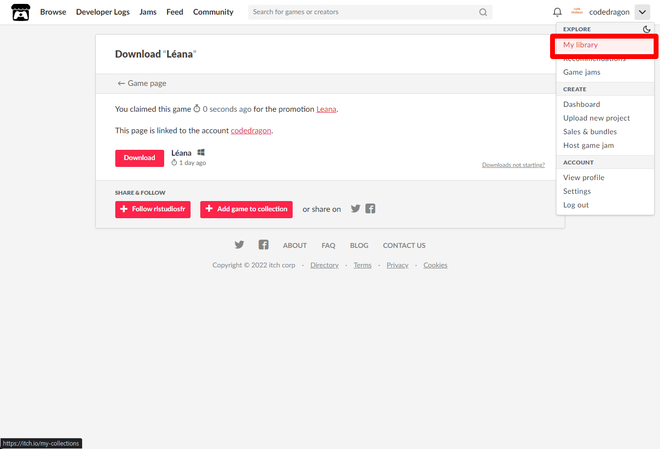 [Claim game]을 클릭하면 "Léana" 게임이 나의 게임 라이브러리에 추가되고 설치파일을 다운받을 수 있는 페이지로 이동됩니다.