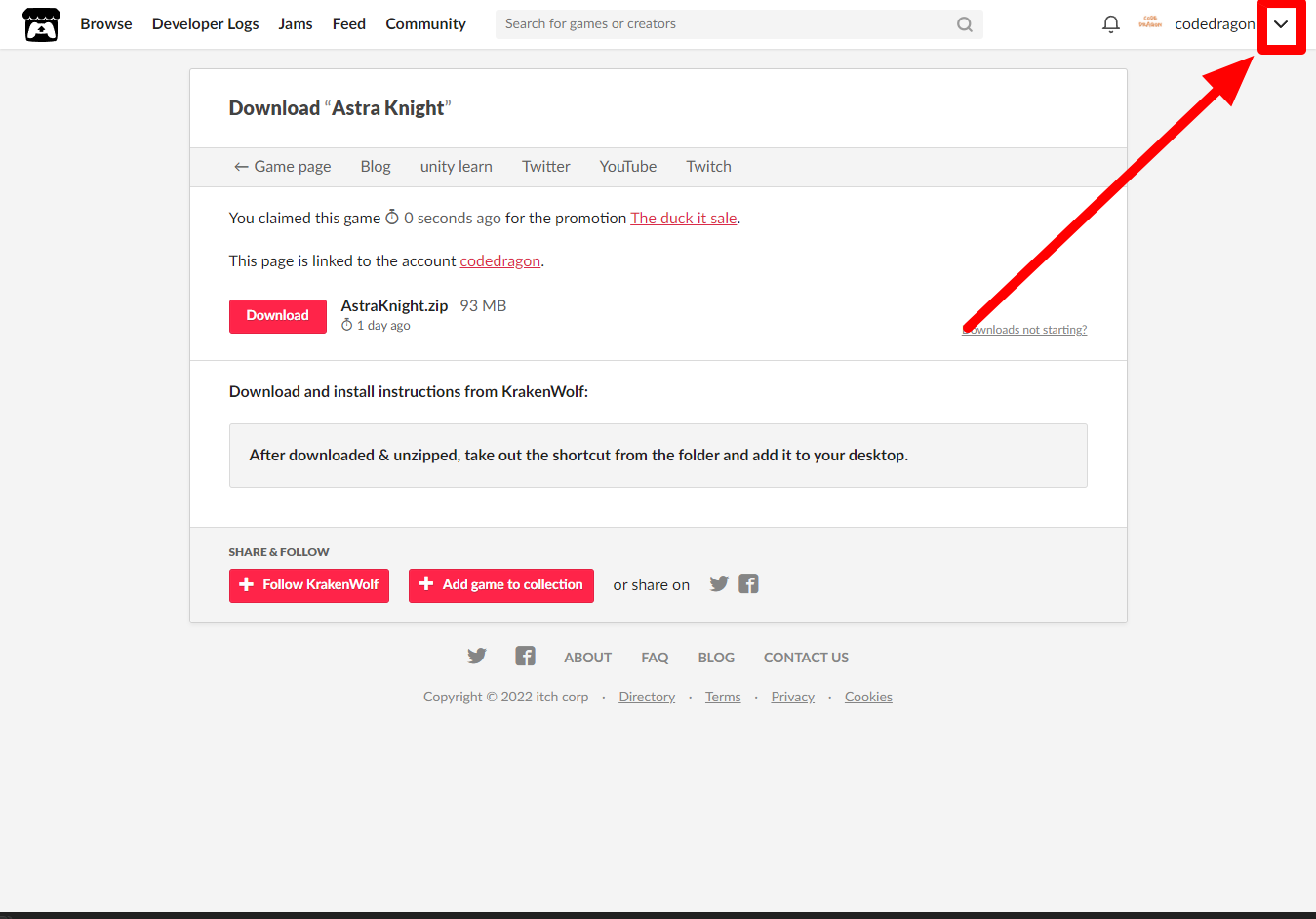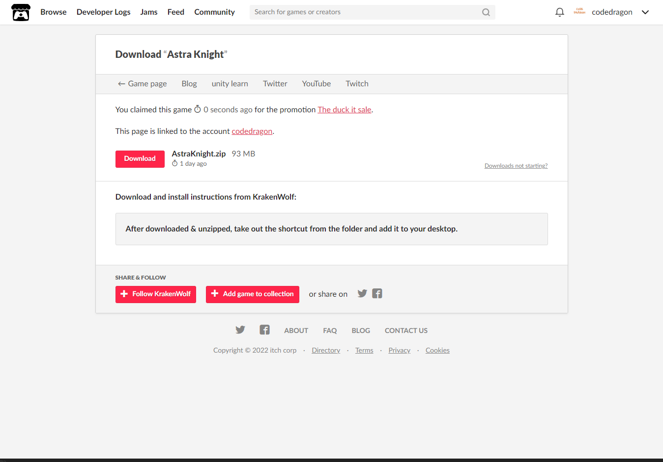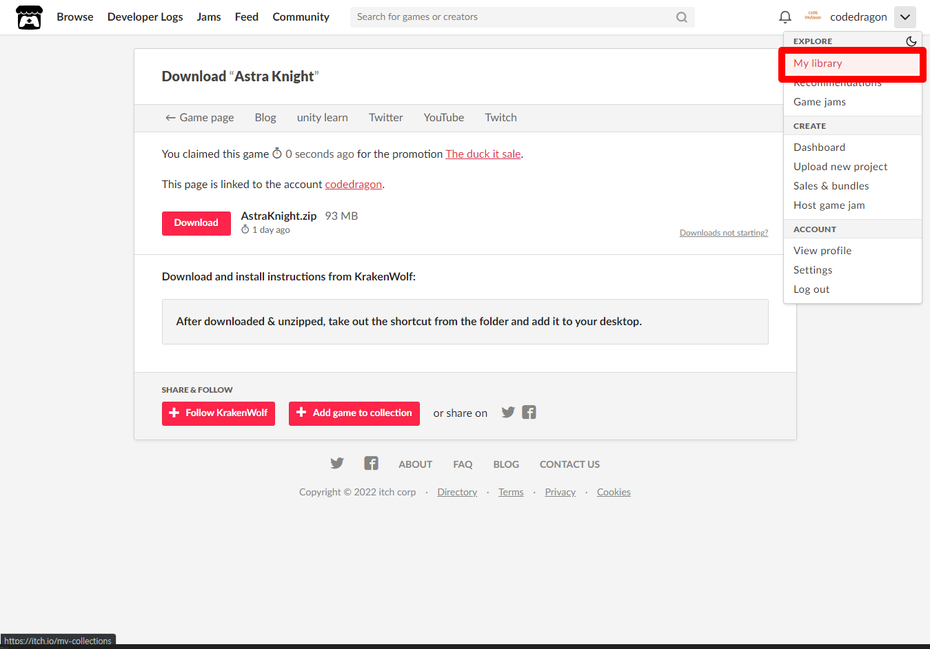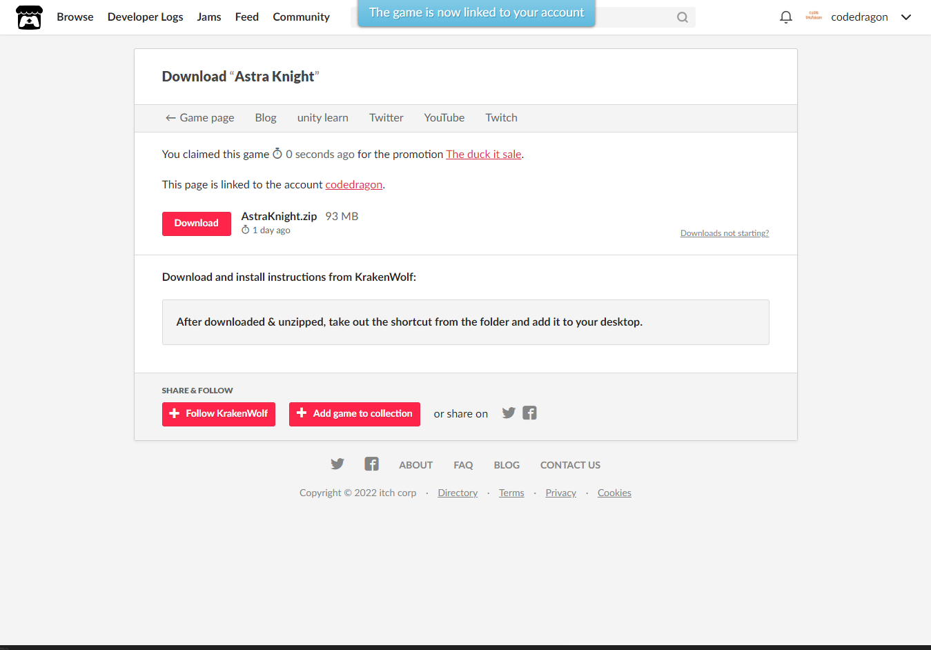 [Claim game]을 클릭하면 "Astra Knight" 게임이 나의 게임 라이브러리에 추가되고 설치파일을 다운받을 수 있는 페이지로 이동됩니다.