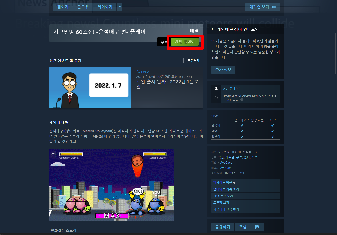 "Meteor Volleyball!" 페이지를 내려 [게임 플레이]를 클릭하면 됩니다.