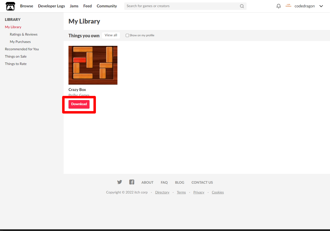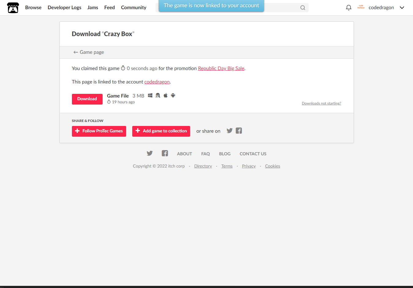 [Claim game]을 클릭하면 "Crazy Box" 게임이 나의 게임 라이브러리에 추가되고 설치파일을 다운받을 수 있는 페이지로 이동됩니다.