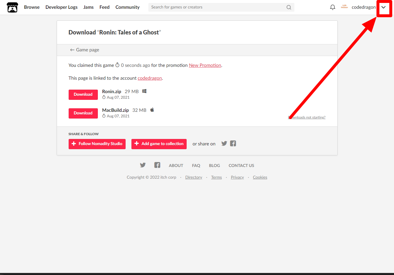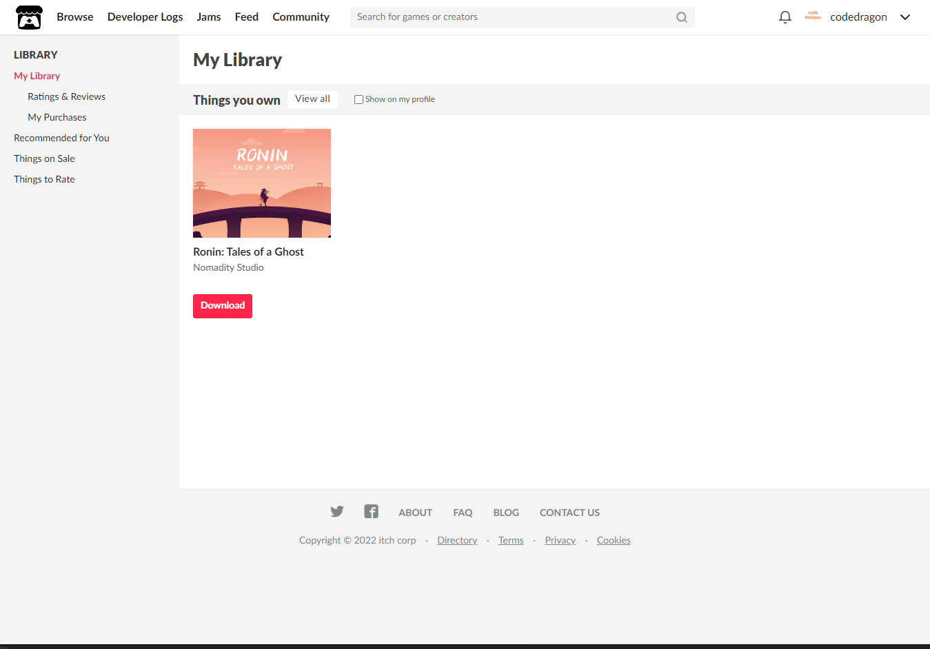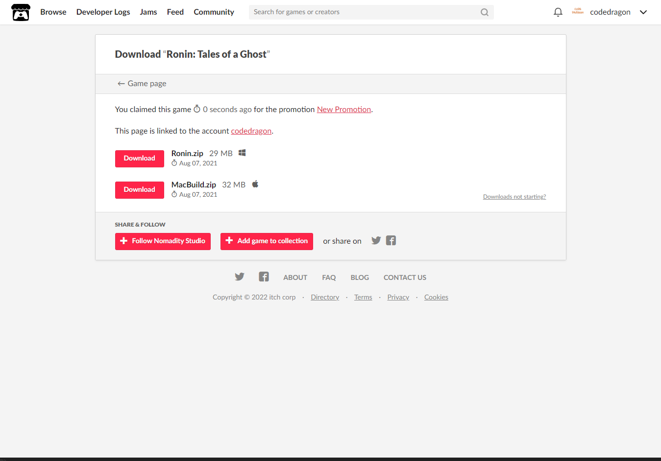 [Claim game]을 클릭하면 "Ronin: Tales of a Ghost" 게임이 나의 게임 라이브러리에 추가되고 설치파일을 다운받을 수 있는 페이지로 이동됩니다.
