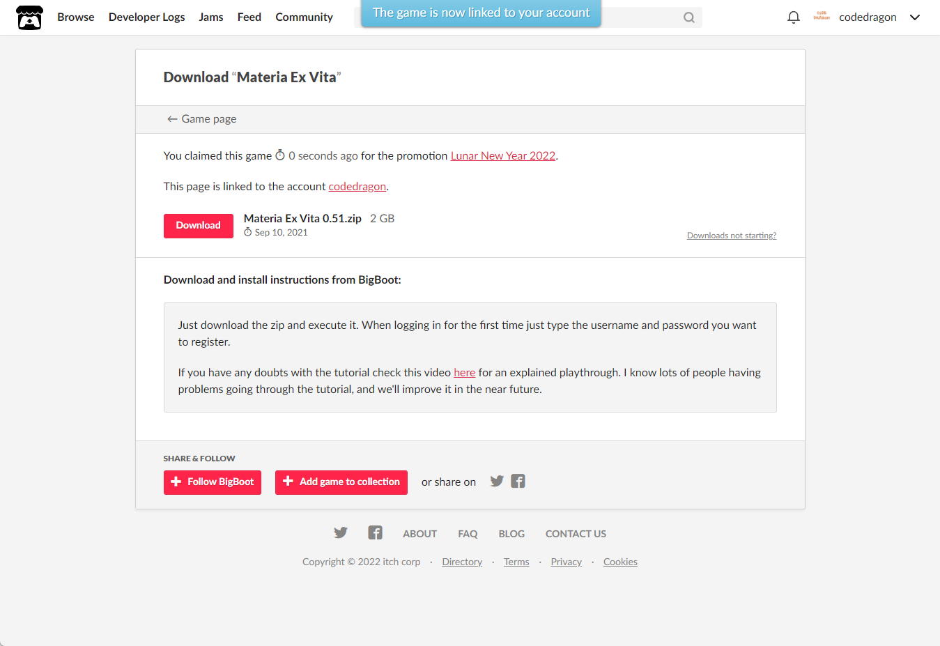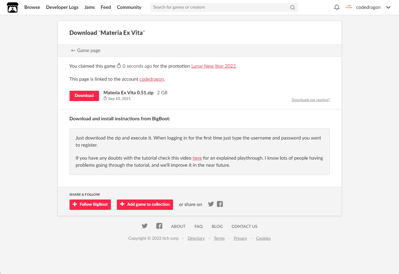"Materia Ex Vita" 해당 항목에 있는 [Download] 버튼을 클릭하면 게임의 설치파일을 다운받을 수 있습니다.