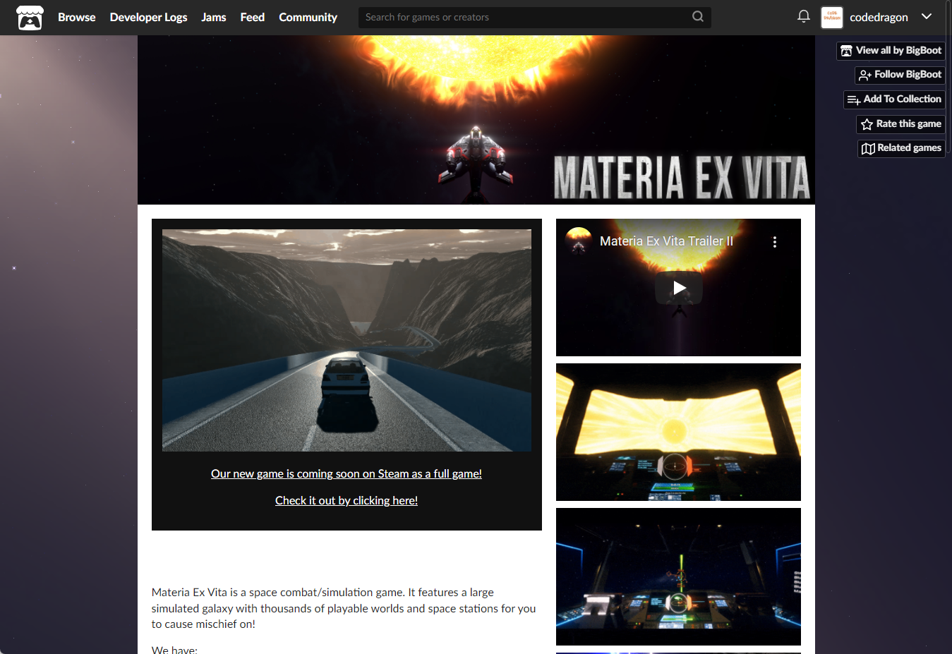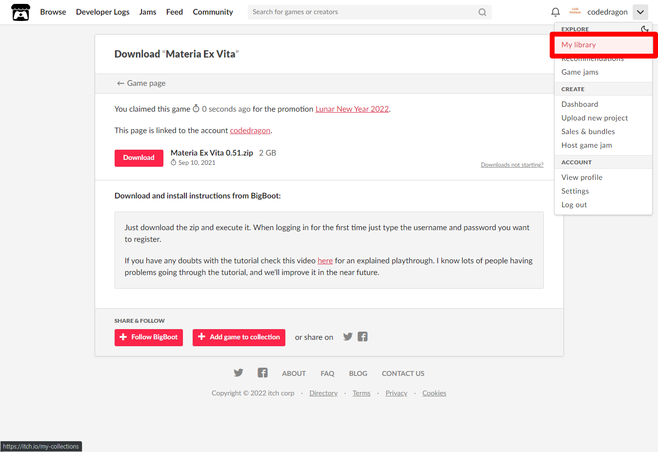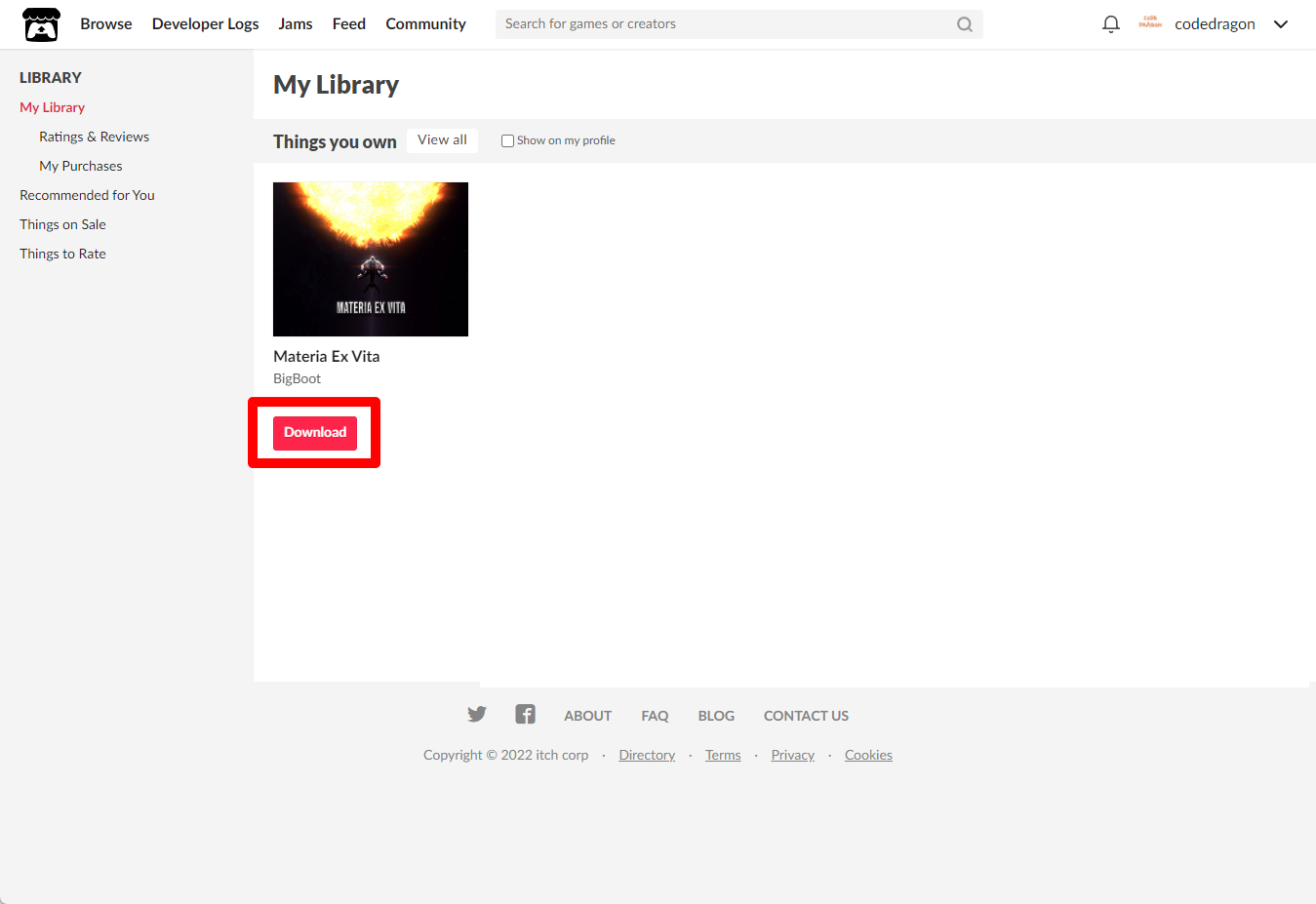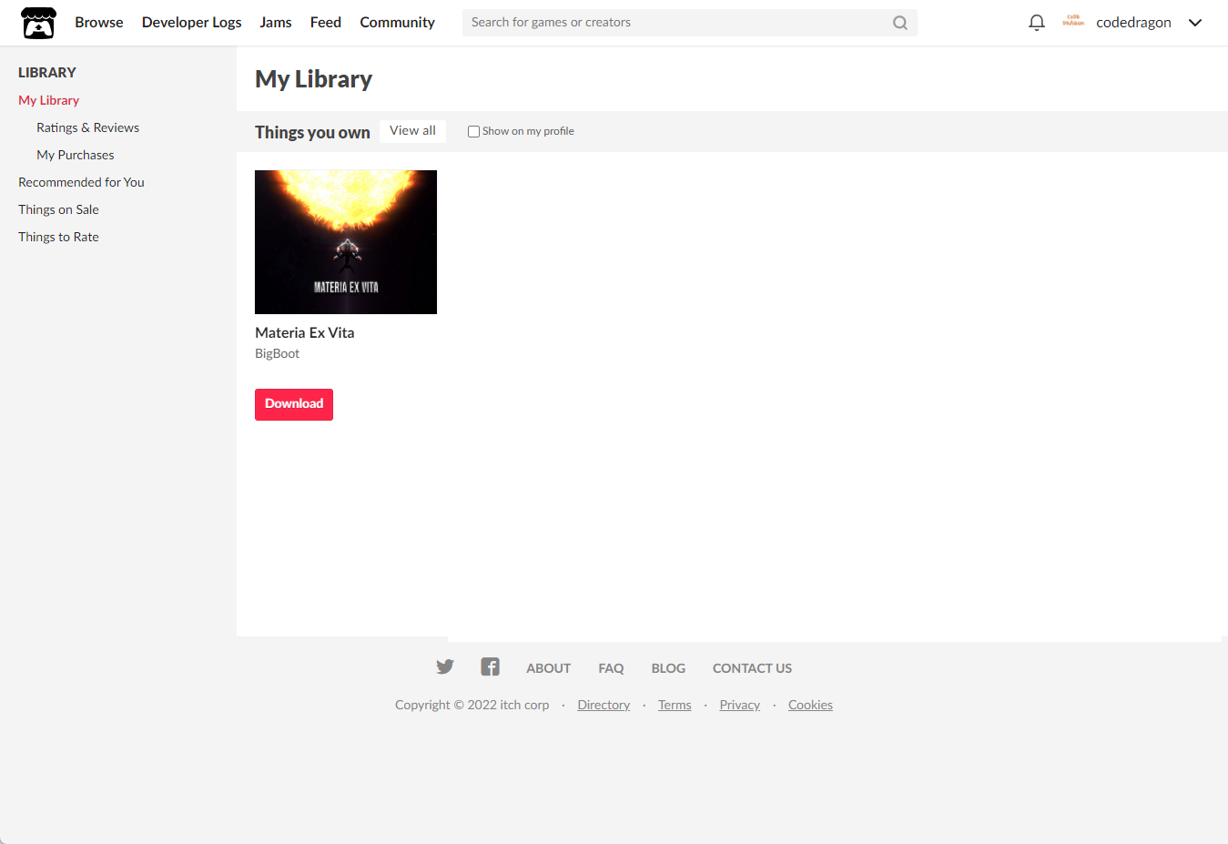 "My Lirary"에서 방금 받은 "Materia Ex Vita" 게임 항목을 확인할 수 있습니다.