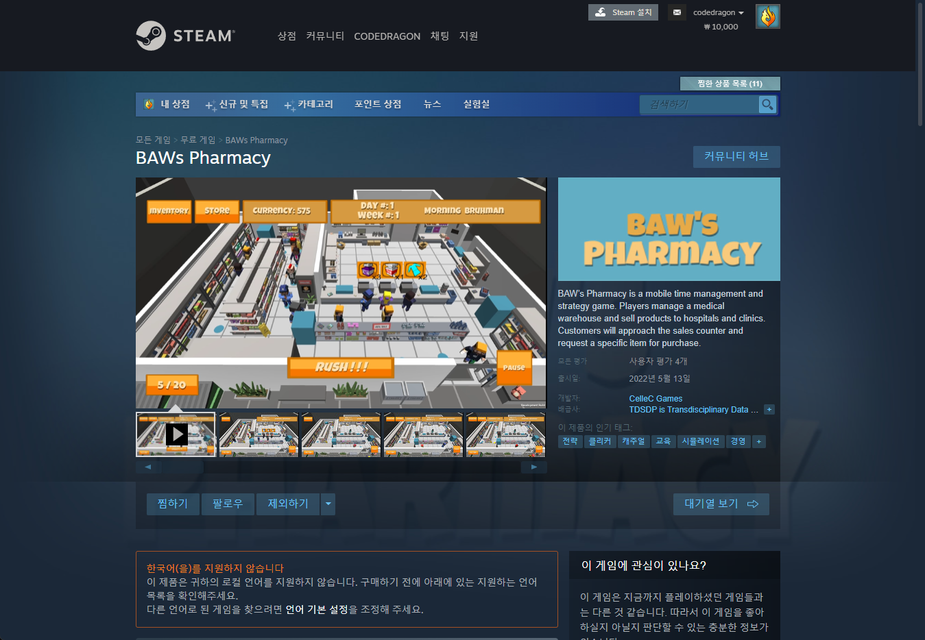 "경영 시뮬레이션"게임인 "BAWs Pharmacy"입니다.
