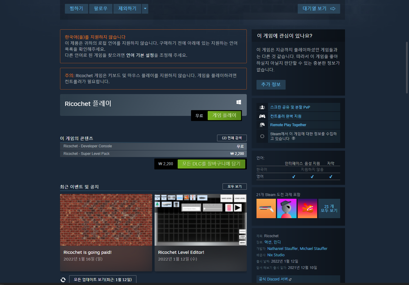 - "Ricochet" 게임 보유 확인
