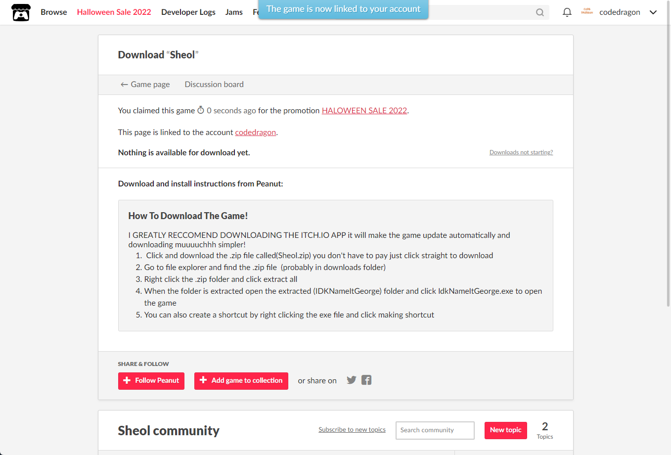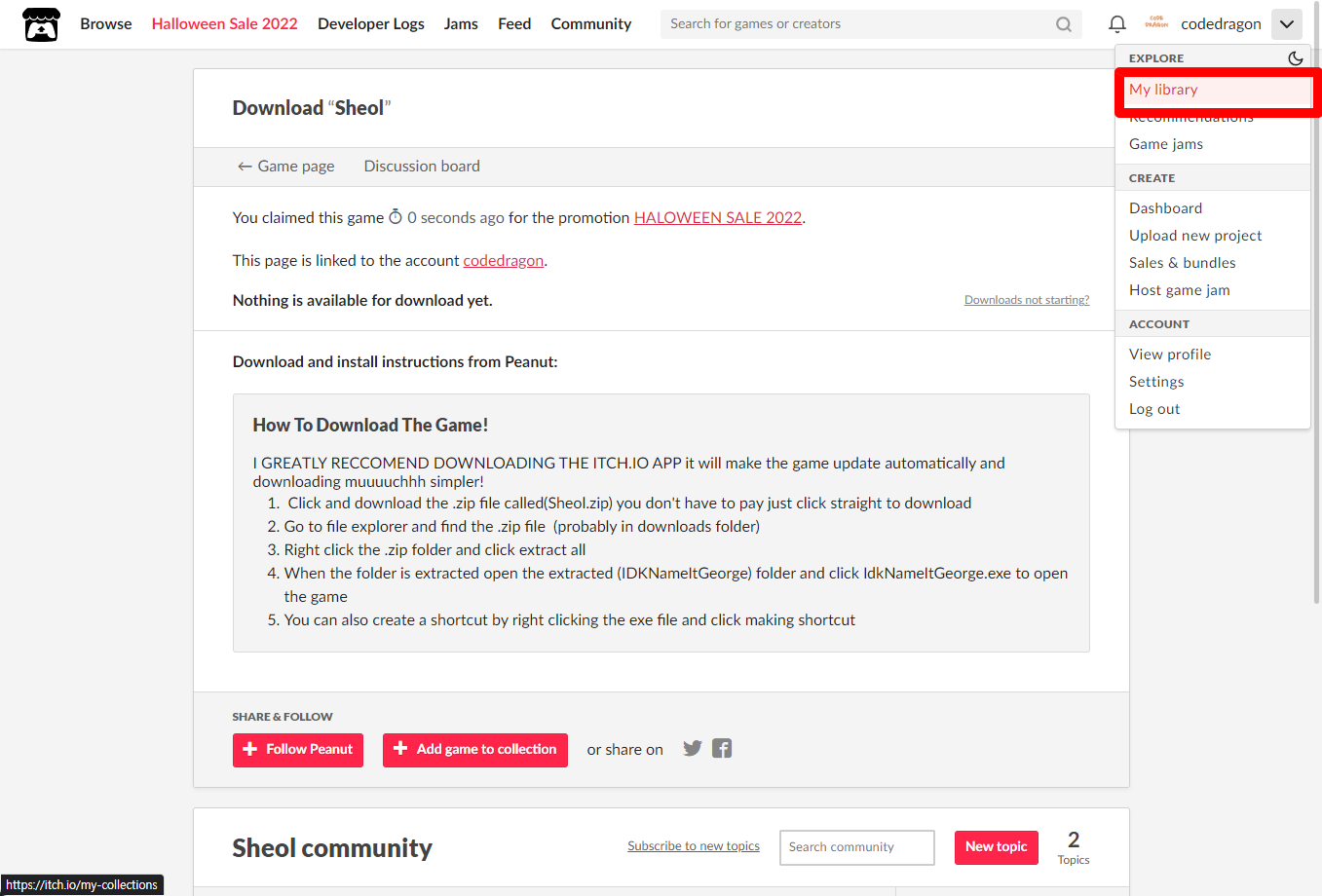 [Claim game]을 클릭하면 "Sheol" 게임이 나의 게임 라이브러리에 추가되고 설치파일을 다운받을 수 있는 페이지로 이동됩니다.