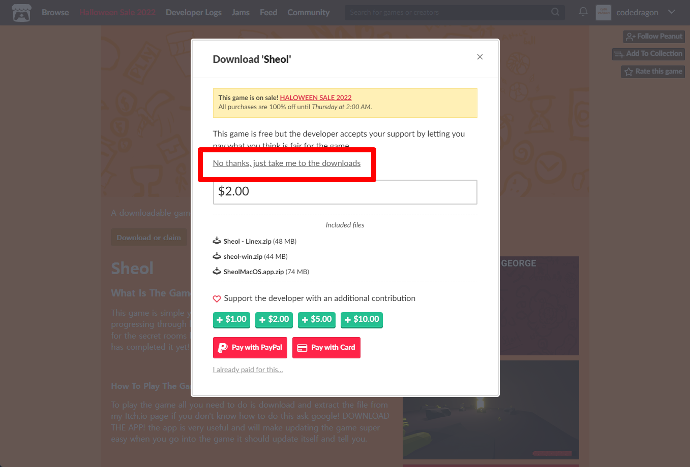 "Sheol" 구매창에서 [No thanks, just take me to the downloads] 링크를 클릭합니다.