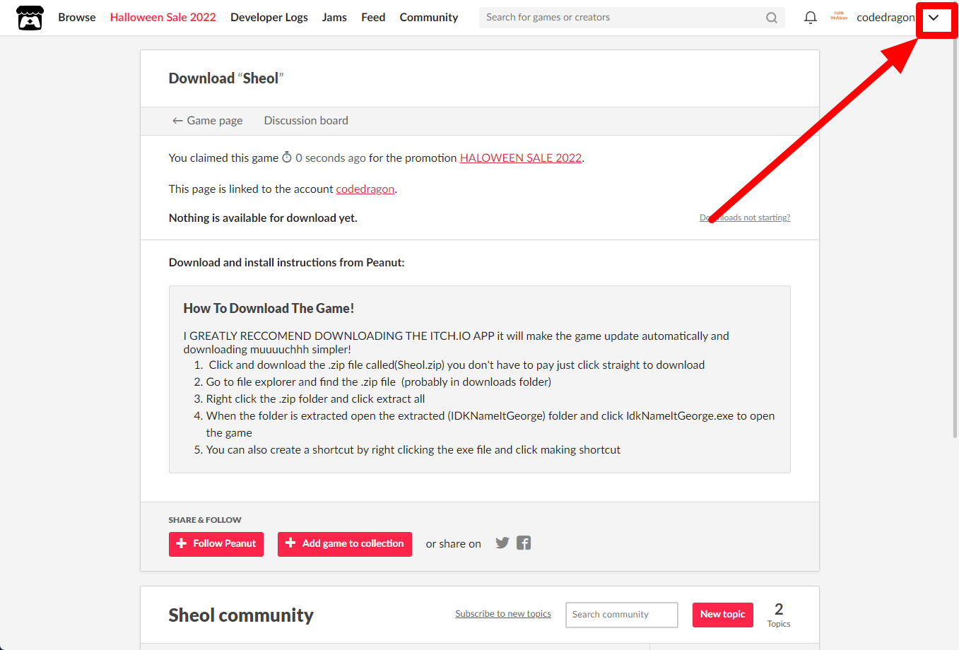 itch.io에서 받은 "Sheol" 게임 확인하고 설치파일 다운받아 보겠습니다. 우측 상단의 나의 사용자명 오른쪽의 화살표 아이콘을 클릭합니다.