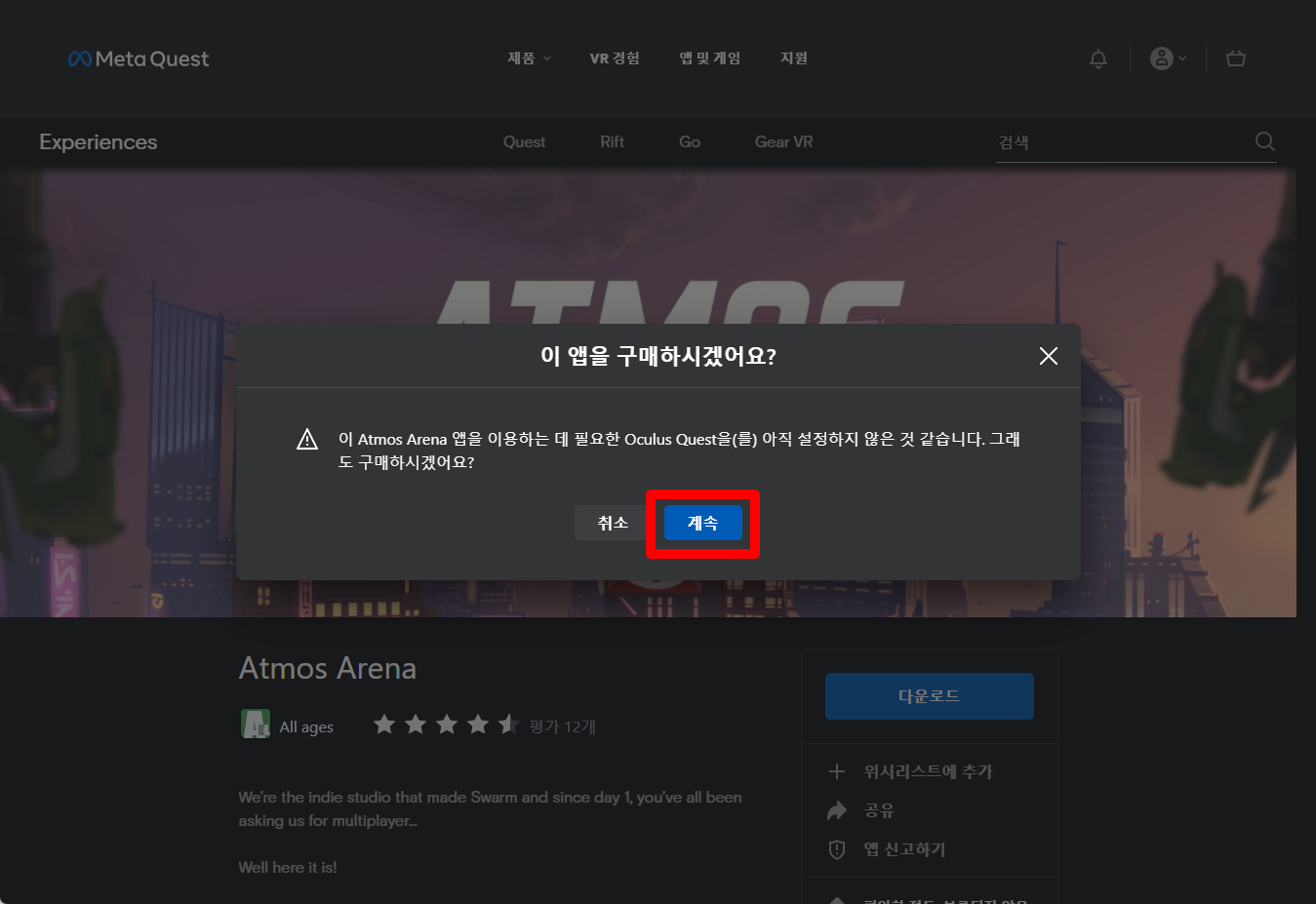 "Atmos Arena" 구매확인창이 나오면 [계속] 클릭합니다.