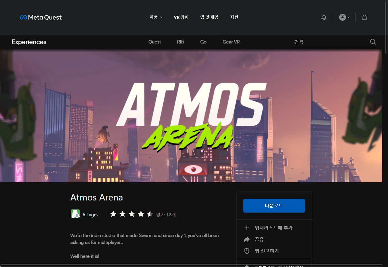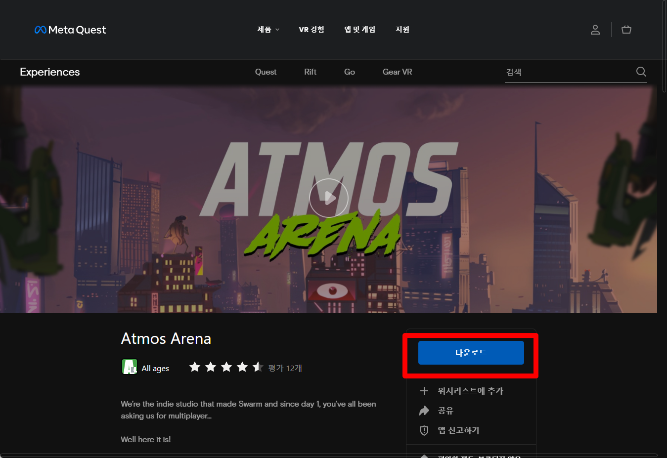 "Atmos Arena" 게임페이지에 있는 [다운로드] 버튼 클릭합니다.
