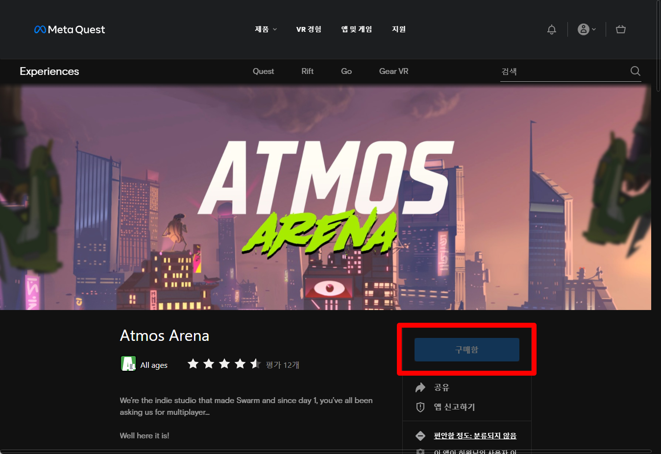 "Atmos Arena" 게임 페이지를 보면 "구매함"으로 표시되어 있어 가지고 있는 것 확인할 수 있습니다.
