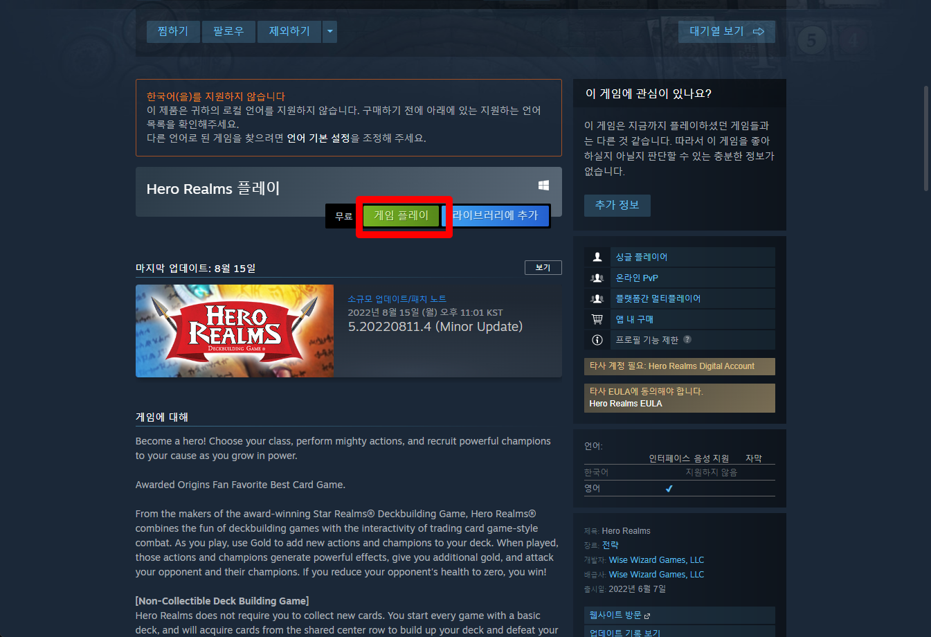 "Hero Realms" 페이지를 내려 [게임 플레이]를 클릭하면 됩니다.