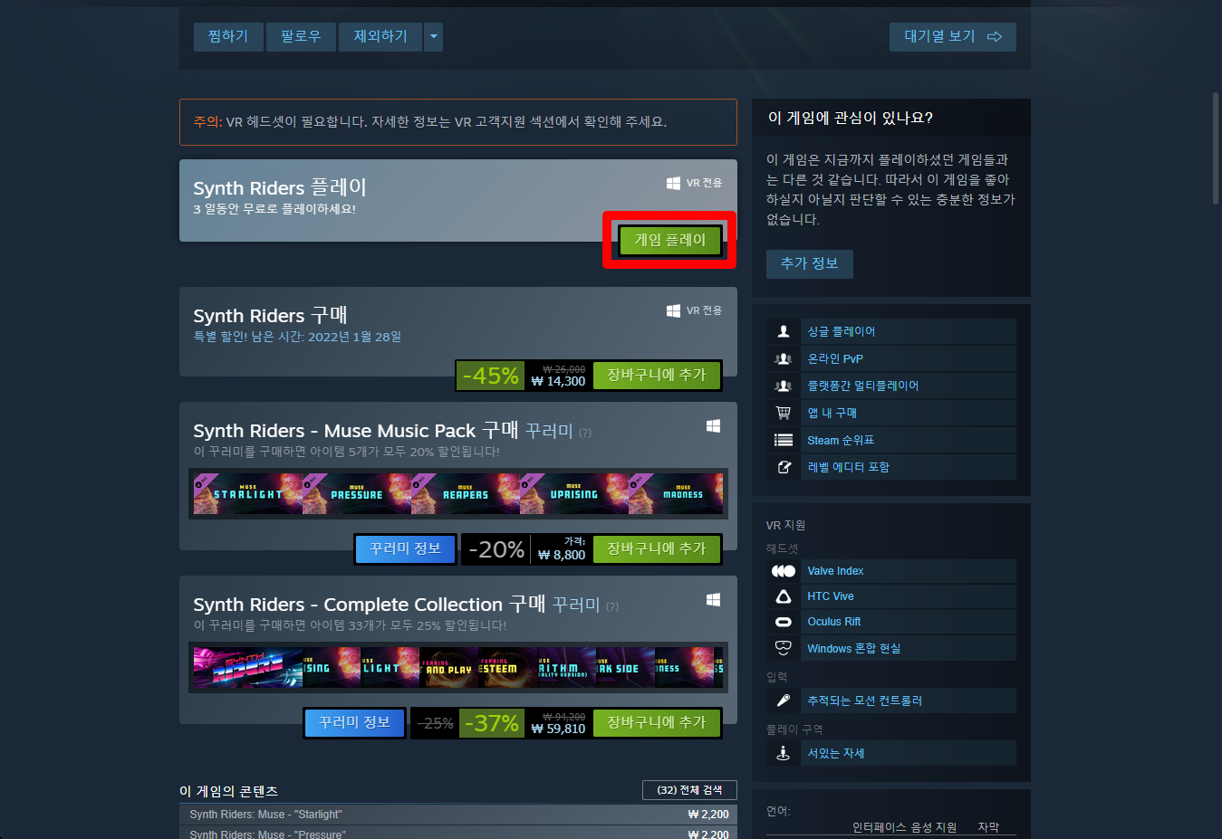 "Synth Riders" 게임페이지를 조금 내려서 [게임 플레이] 버튼을 클릭하면 됩니다.
