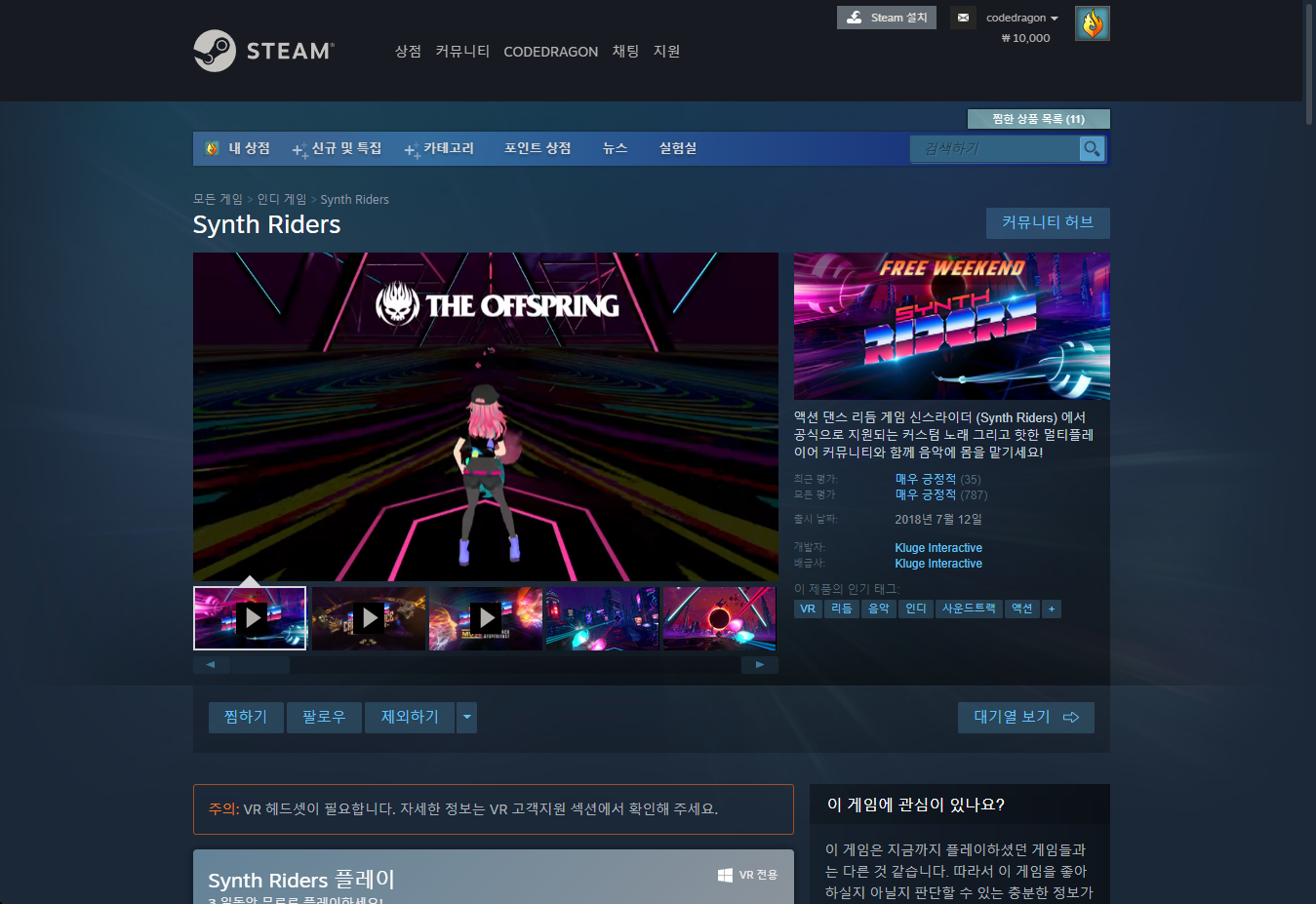 금주 게임은 "VR" 게임인 "Synth Riders" 입니다.