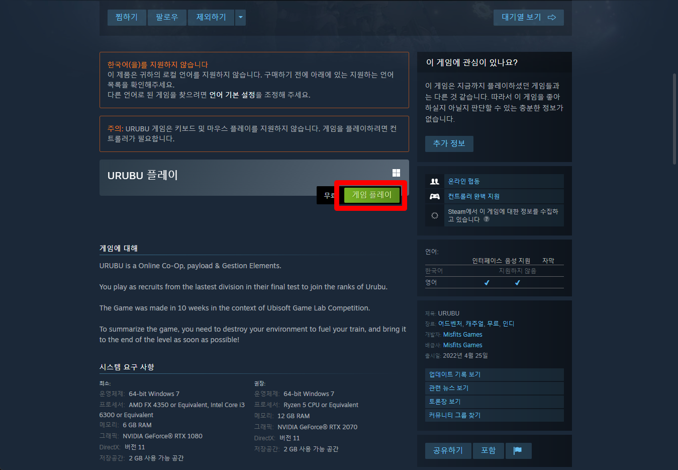 "URUBU" 페이지를 내려 [게임 플레이]를 클릭하면 됩니다.