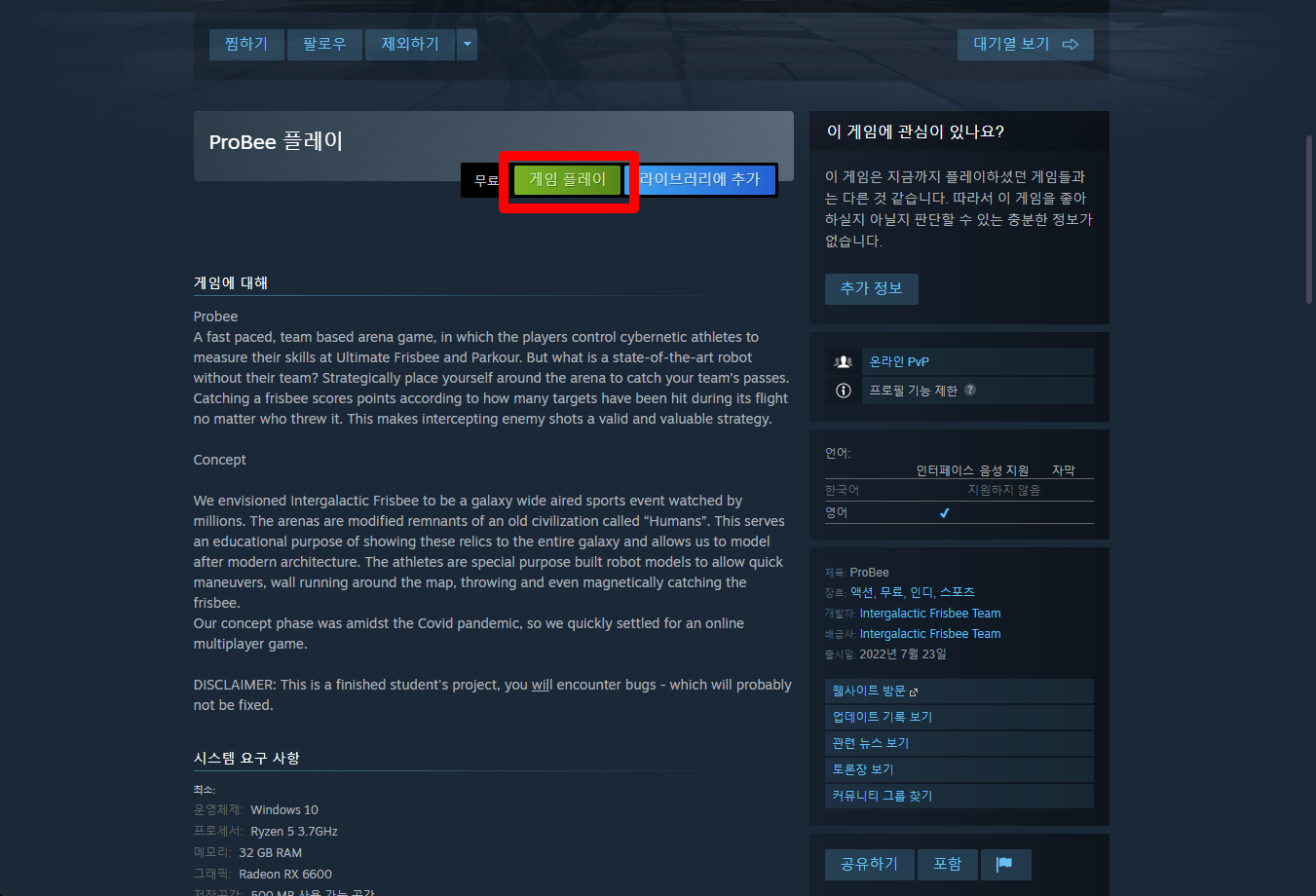 "ProBee" 페이지를 내려 [게임 플레이]를 클릭하면 됩니다.
