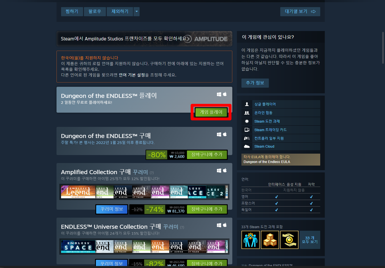 "Dungeon of the ENDLESS" 게임페이지를 조금 내려서 [게임 플레이] 버튼을 클릭하면 됩니다.
