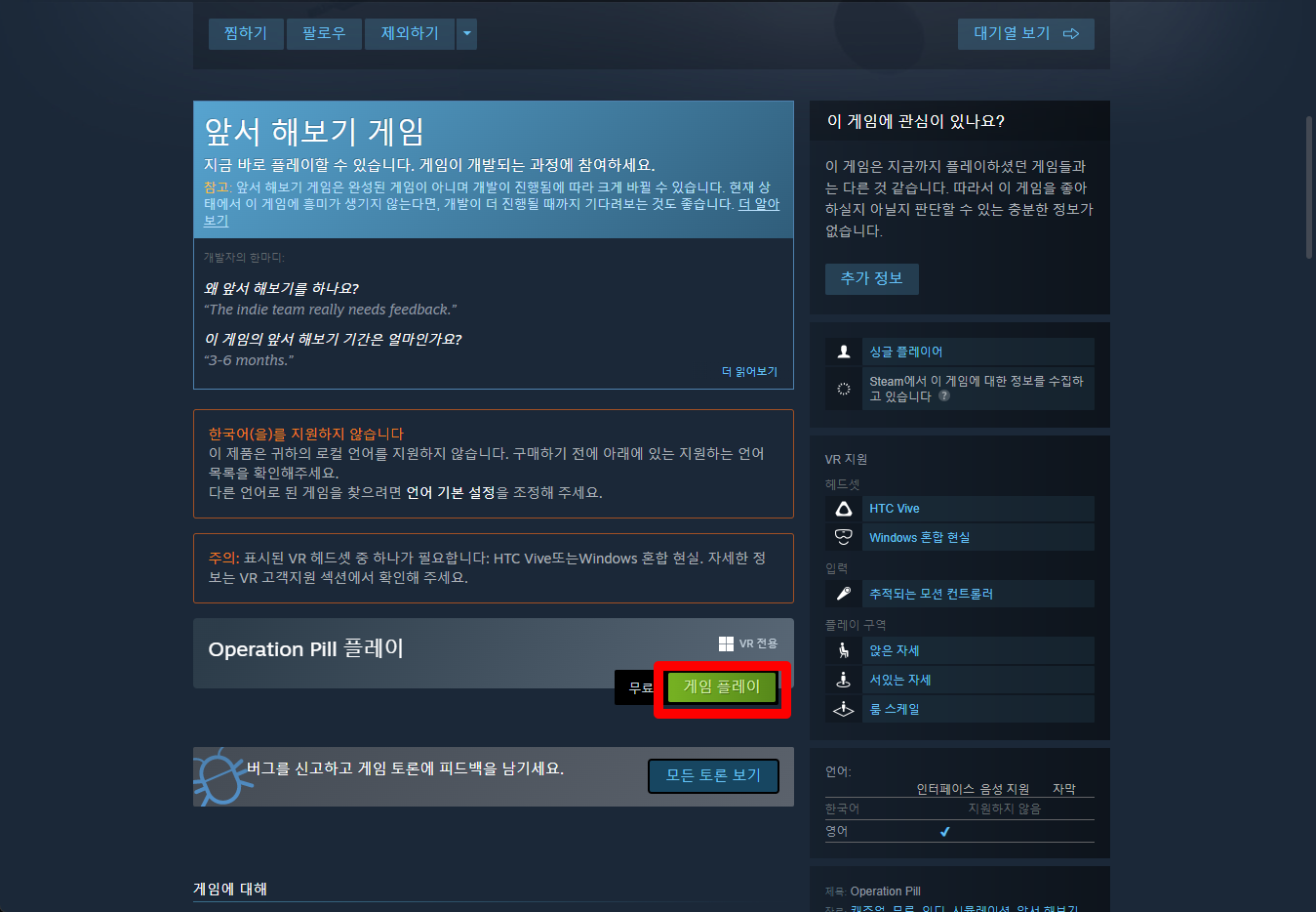 "Operation Pill" 페이지를 내려 [게임 플레이]를 클릭하면 됩니다.