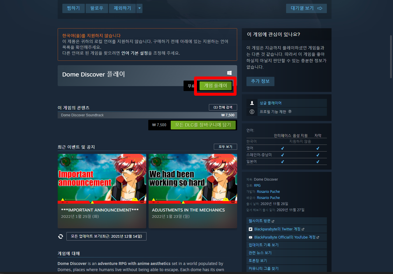 "Dome Discover" 스팀 페이지 입니다.