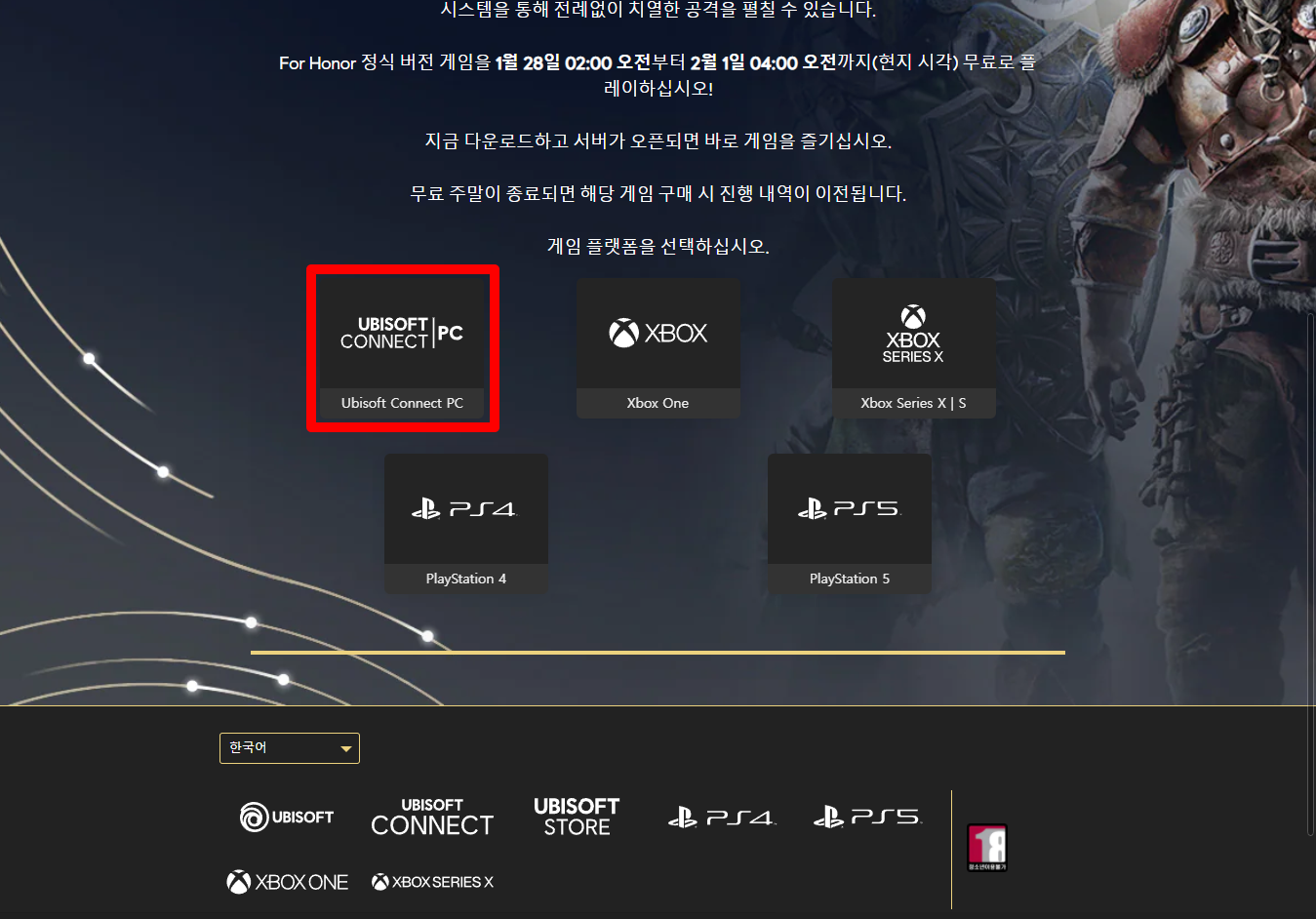 "For Honor" 게임페이지를 조금 내려서 [UBISOFT CONNECT | PC] 버튼을 클릭하면 됩니다.
