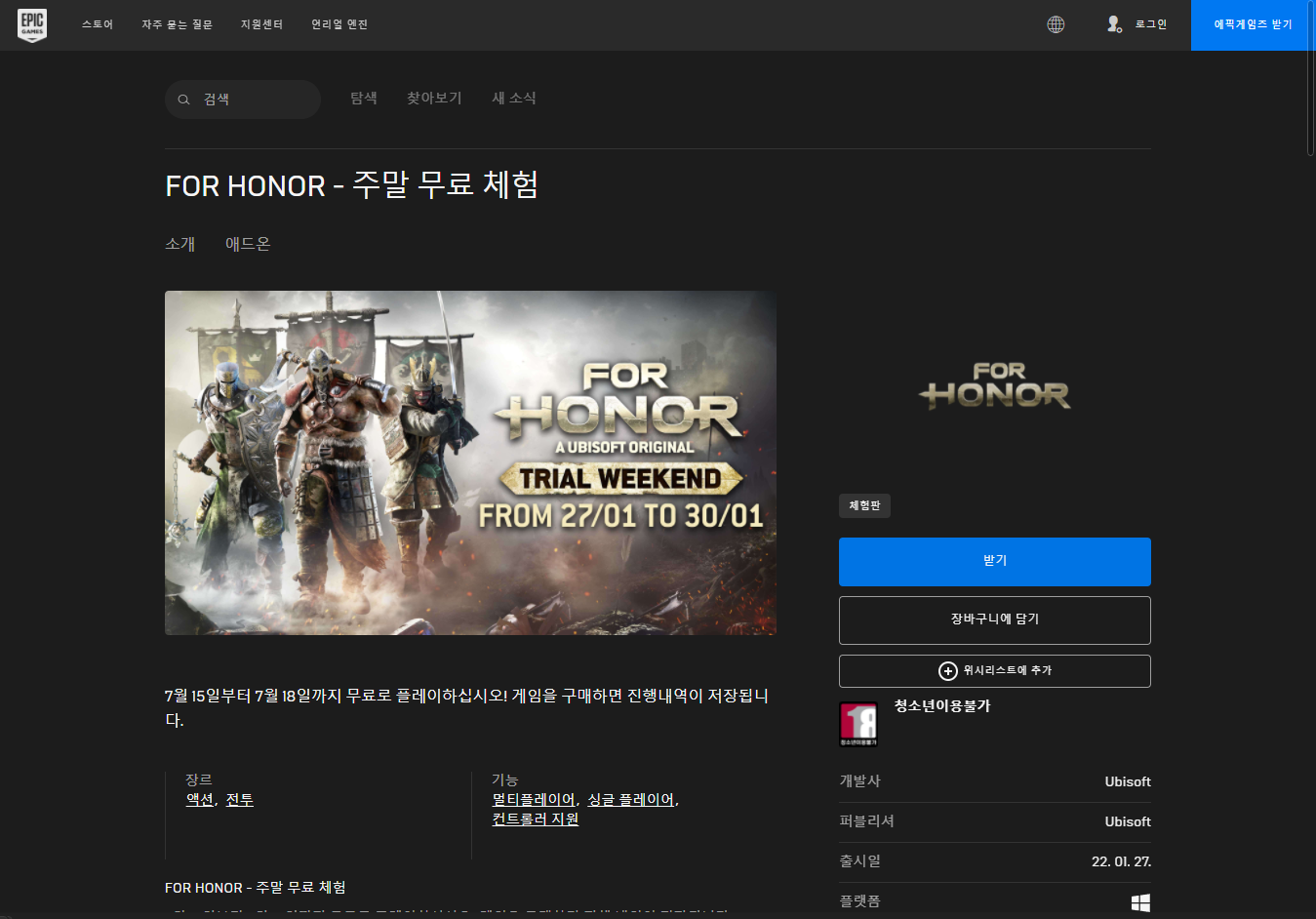 - FOR HONOR - 주말 무료 체험; 에픽 게임즈 epic games