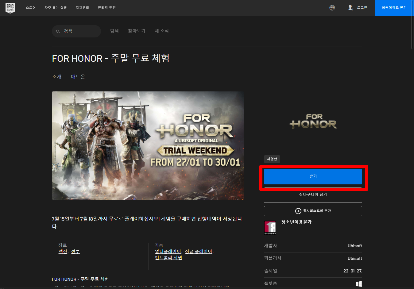"FOR HONOR" 게임페이지에서 [받기] 버튼을 클릭해서 게임을 나의 계정에 추가한 후 설치하면 됩니다.