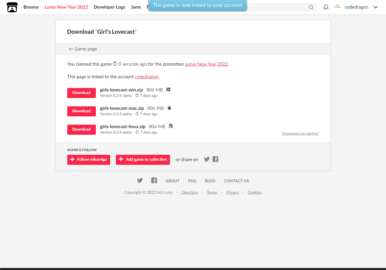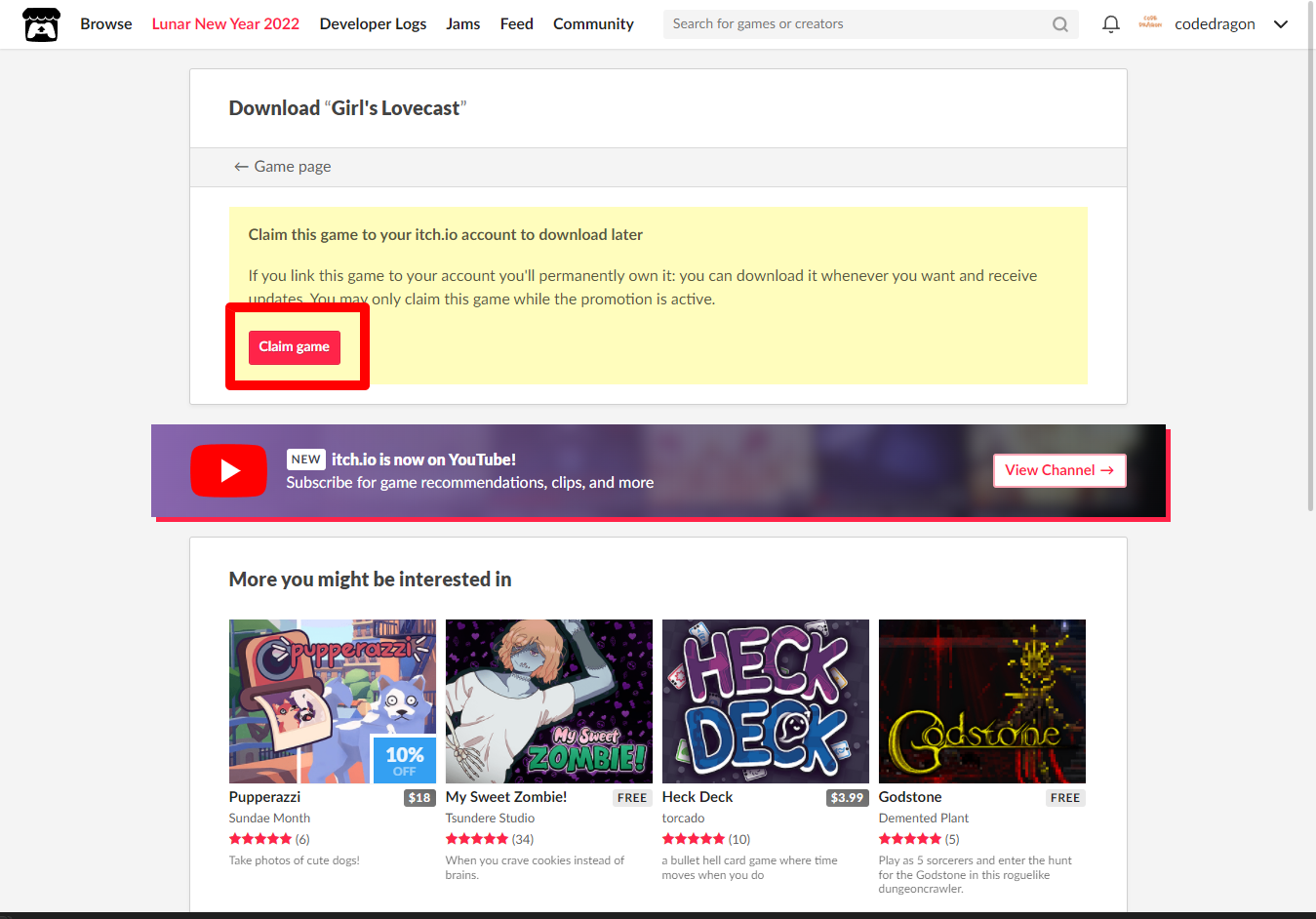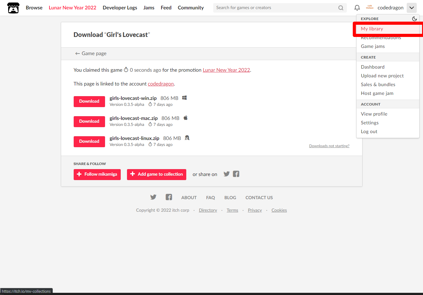 [Claim game]을 클릭하면 "Girl's Lovecast" 게임이 나의 게임 라이브러리에 추가되고 설치파일을 다운받을 수 있는 페이지로 이동됩니다.